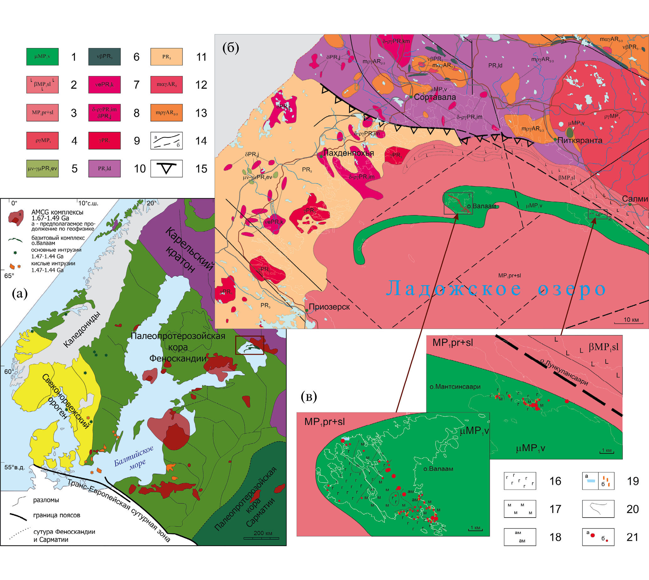 Рис. 1. (а) Геологическое положение Валаамского силла в структурах северо-запада Восточно-Европейского кратона по (Brander, Söderlund, 2007) и (Grabarczyk et al., 2023), с дополнениями. Прямоугольником выделена область, показанная на (б). (б) Геологическая схема Северного Приладожья показывает позицию Валаамского силла в пределах Ладожского грабена в области сочленения Карельского кратона и свекофенской орогенной области. 1, 2: вулканическая ассоциация Ладожского грабена: 1 – Валаамский силл, феррогаббро, кварцевые ферромонцогаббро, монцодиориты, кварцевые монцониты, графические лейкограниты (µМР1v); 2 – ферробазальты, салминская свита (βMP1sl); 3 – алевролиты, песчаники, приозерская и салминская свиты, (МР1pr+sl); 4 – Салминский массив AMCG-типа (ργМР1). 5–11: Свекофенская орогенная область: 5 – Элисенваарско-вуоксинский монцогаббро-монцонит-сиенит-гранитовый комплекс (µν-γµPR3ev); 6 – диорит-базитовый комплекс (νβPR1); 7 – куркиекский норит-эндербитовый (νePR1k) и 8 – диорит-тоналитовые импиниемский и яккимский ((δ-ργPR1im δPR1j) комплексы; 9 – граниты нерасчлененные (γPR3); 10 – ладожская серия, биотитовые гнейсы, кварц-слюдяные сланцы и другие метаморфиты (PR1ld); 11 – исоярвинская метаморфическая толща, метатуффиты (PR1). 12 – синскладчатые нерасчлененные плутонические комплексы, мигматиты, граниты (mαγAR3); 13 – мигматит-плагиогранитные комплексы Карельского кратона (mργAR2–3); 14 – разломы: а – достоверные, б – предполагаемые; 15 – Мейерский надвиг. (в) – район работ. Геологическая основа по (Максимов и др., 2015; Степанов и др., 2004), с изменениями; геологические схемы участков детальных работ на островах, показаны прямоугольниками на (б): 16 – феррогаббо; 17 – кварцевые монцониты, 18 – амфиболовые кварцевые монцониты; 19 – жилы: а – кварцевых монцонитов, б – графических лейкогранитов; 20 – контуры разновидностей пород; 21 – точки наблюдения: а – использованные в настоящей работе и в Supplementary 1, ESM_1, б – прочие.