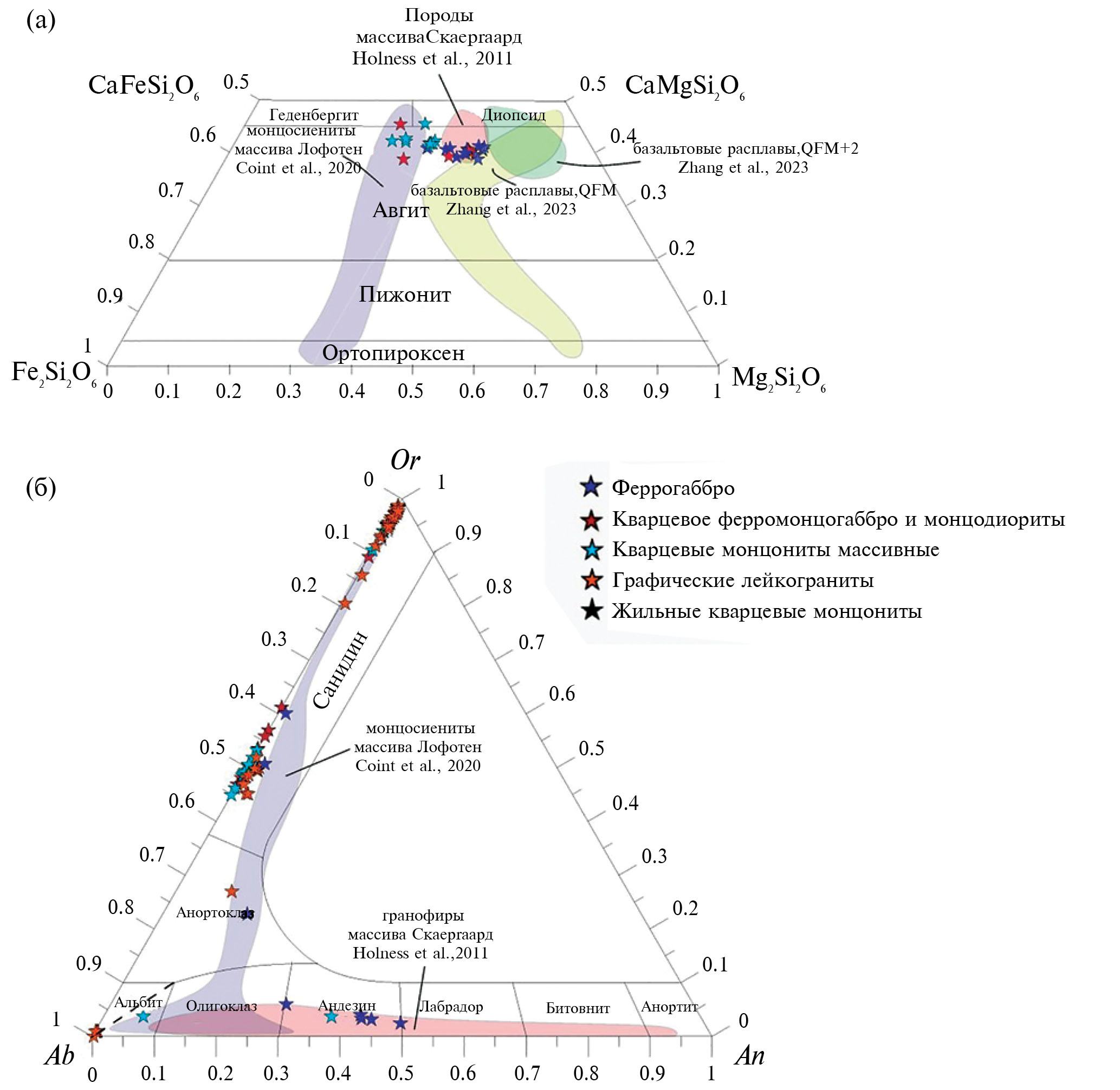 Рис. 5. (а) Диаграмма составов пироксенов из пород Валаамского силла в координатах Fe2Si2O6–Mg2Si2O6–CaFeSi2O6–CaMgSi2O6. Дополнительно представлены поля составов пироксенов из гранофиров массива Скаергаард (Holness et al., 2011), монцосиенитов массива Лофотен (Coint et al., 2020) и из экспериментальных базальтовых расплавов, кристаллизовавшихся при фугитивности кислорода, соответствующей QFM и +2ΔQFM (Zhang et al., 2023). (б) Диаграмма составов полевых шпатов из пород Валаамского силла в координатах An–Ab–Or. Дополнительно вынесены поля составов полевых шпатов из гранофиров массива Скеергаард (Holness et al., 2011) и монцосиенитов массива Лофотен (Coint et al., 2020).