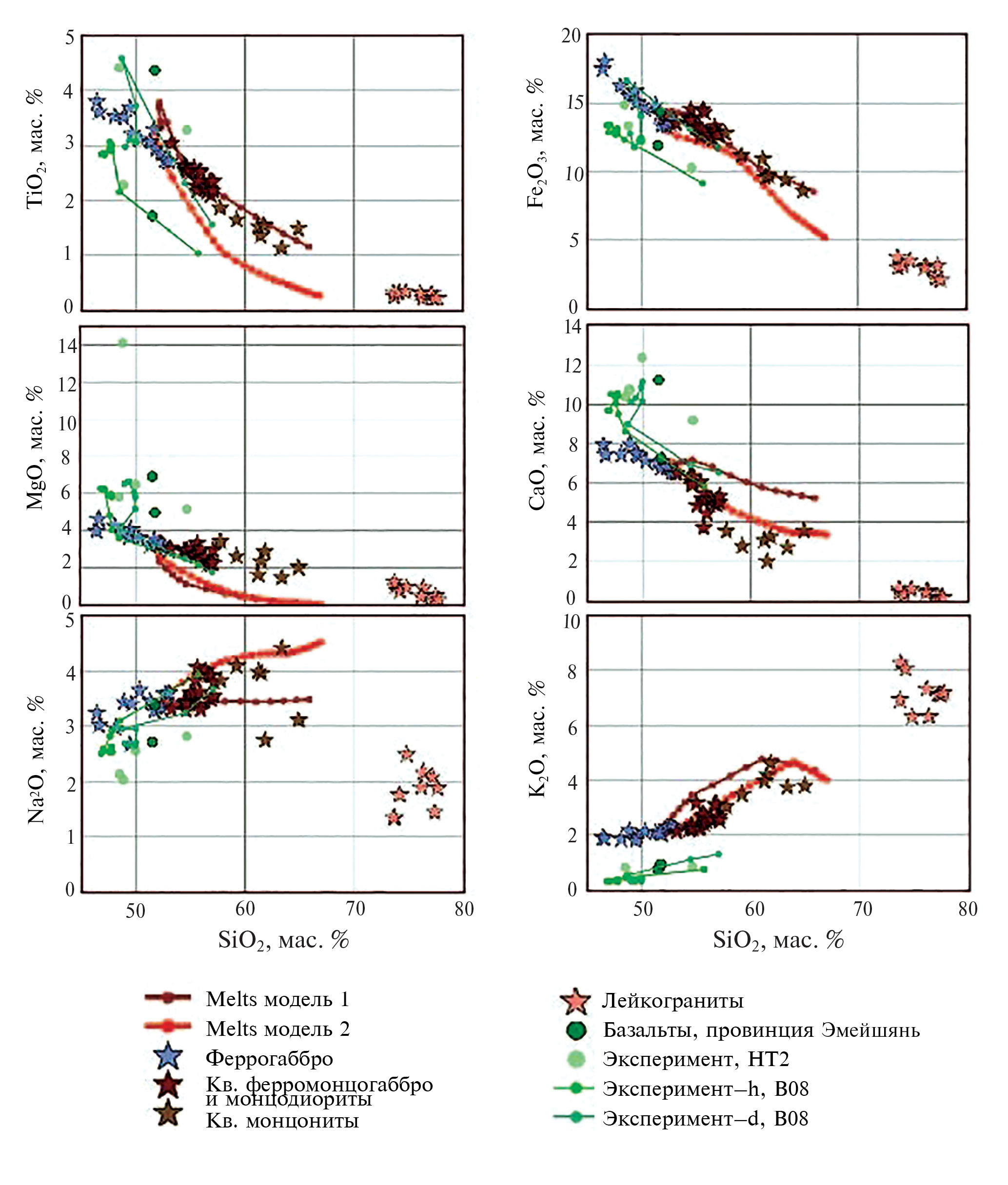 Фракционирование базальтовых расплавов по толеитовому (феннеровскому) тренду предполагает накопление Fe без увеличения содержания SiO2 в расплаве и формирование феррогаббро в качестве конечного дифференциата (Fenner, 1929). Этот тренд в ряде случаев продолжается, последовательно или скачком, появлением расплавов с понижающимся содержанием Fe и возрастающим – SiO2, вплоть до ультракислых составов, т. е. формально по Боуэновскому тренду (Bowen-like trend, Lesher et al., 2023).