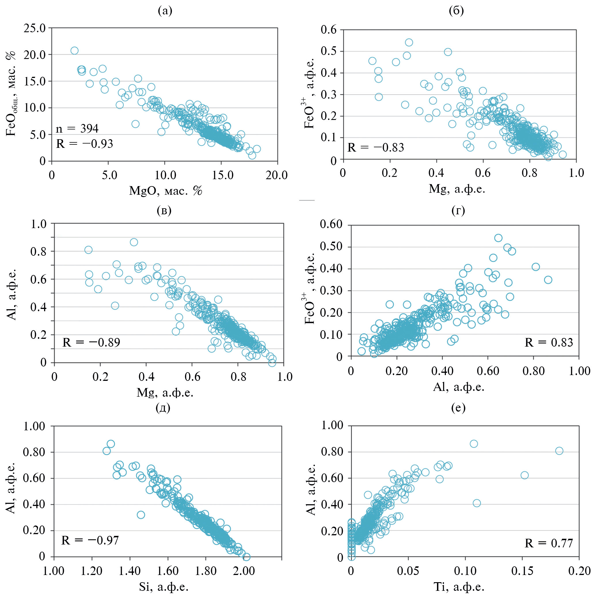 Рис. 11. Вариации составов магнезиохромита (Mchr) и членов серии магнезиоферрит–магнетит (Mfr–Mag) на диаграммах Fe2+–Mg (a) и Fe3+–Al (б), выраженные в значениях атомов на форм. ед. (а. ф. е.). Значение коэффициента корреляции (R), указанное на рис. 11б, рассчитано на основе составов членов серии Mfr–Mag (n = 30).