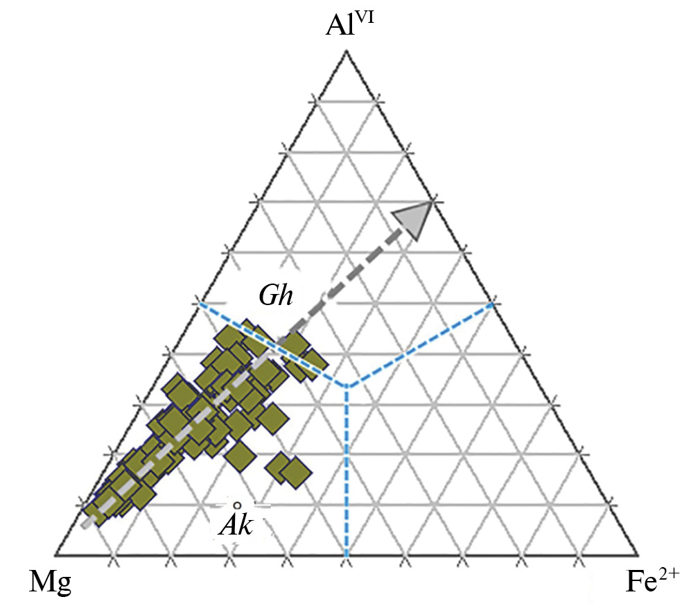 Выявлены две генерации минералов группы шпинели, представленные магнезиохромитом и членами серии магнезиоферрит–магнетит. Последняя серия твердых растворов включает шпинелиды, наиболее обогащенные Fe3+ (рис. 3д, 3е). Представительные составы минералов группы шпинели приводятся в табл. 3, тогда как в Supplementary 1, ESM_9 представлен более широкий спектр наблюдаемых составов. Как можно видеть, в теле присутствуют разновидности шпинели, хромистой шпинели и магнезиохромита с высокой концентрацией Fe3+, глиноземистого магнезиохромита (также обогащенного Fe3+), глиноземистого магнезиоферрита и магнезиального магнетита. Значительное обогащение Fe3+ и Al выражается в высоких содержаниях магнезиоферритового, магнетитового, а также шпинелевого компонентов. Наблюдаемый тренд кристаллизации, вероятно, простирается от наиболее ранних фаз магнезиохромита к высокомагнезиальным фазам магнезиоферрита и далее к магнетитовой серии составов, в которой содержание Mag последовательно возрастает в ходе кристаллизации (рис. 10, 11a, 11б).