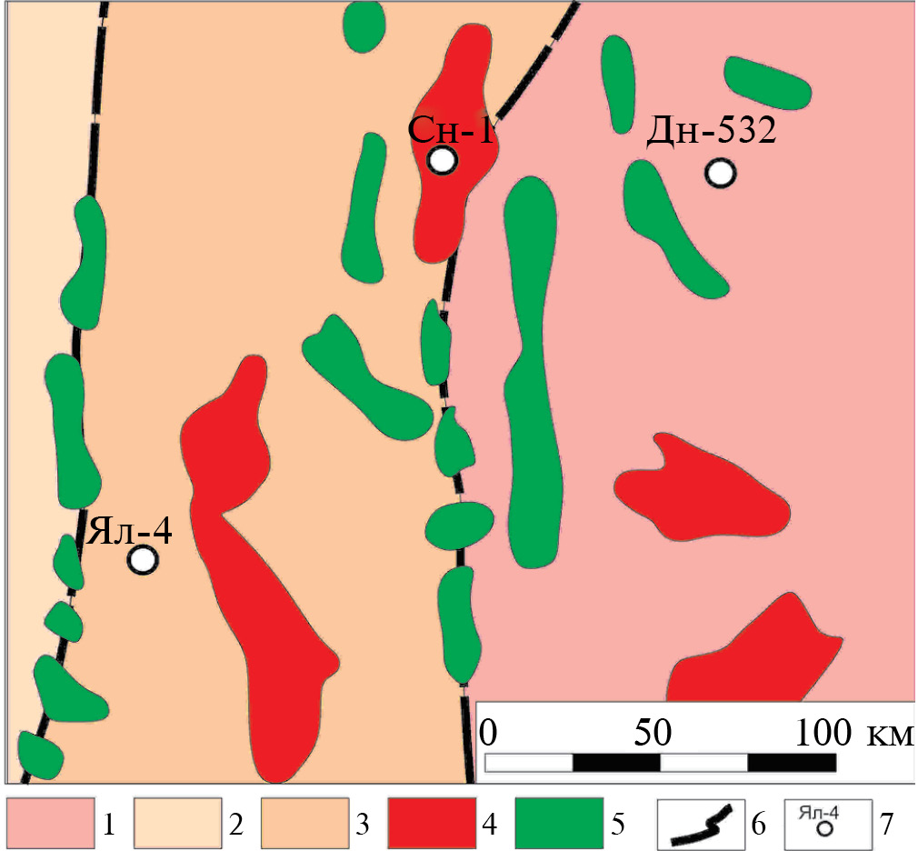 Как отмечалось выше, исследованная область фундамента на большинстве схем (Rosen et al., 1994; Gladkochub et al., 2006; Donskaya, 2020) охватывает область сочленения Тунгусского супертеррейна и Маганского террейна, которая может представлять собой либо относительно узкую шовную зону, либо коллизионный пояс, образованный при столкновении двух раннедокембрийских блоков (например, Восточно-Тунгусский складчатый пояс, 2.1–1.9 млрд лет) (Глебовицкий и др., 2008), либо аккреционный ороген, маркирующий конвергентую границу и сложенный преимущественно палеопротерозойскими породными ассоциациями (Priyatkina et al., 2020). Расположенная на крайнем юго-западе Непско-Ботуобинской антеклизы скв. Ял-4 вскрывает мезоархейские гнейсы, отвечающие по составу типичным для архея ТТГ-комплексам, и, наиболее вероятно, фиксирует распространение архейского фундамента Тунгусского супертеррейна. Далее к северу аналогичная граница маркируется неоархейскими (2.53 млрд лет) гранитами в скв. Кулиндинская-1 (рис. 1), субсинхронными с гранитами Юрубченского массива на западе Тунгусского супертеррейна (Самсонов и др., 2021, 2022). Коллизионные процессы и гранитоидный магматизма конца неоархея (∼2.55 млрд лет) характерны для обнаженного фундамента в Шарыжалгайском выступе (Гладкочуб и др., 2005; Туркина, Сухоруков, 2022). Кроме того, неоархейские (2.60–2.45 млрд лет) детритовые цирконы образуют один из главных максимумов в осадочных отложениях чехла западной части Сибирского кратона (Priyatkina et al., 2020). Таким образом, неоархейские тектоно-магматические процессы являются реперными для Тунгусского супертеррейна в целом. Поскольку данное термальное событие находит отражение в изотопном составе и возрасте краевых зон циркона из гнейсов скв. Ялтыкская-4, это служит веским доказательством принадлежности последних к фундаменту Тунгусского супертеррейна. Обоснованием положения границы Тунгусского супертеррейна в центральной части Сибирского кратона является резкая смена неоархейских гранитов и биотитовых гнейсов с модельным Nd возрастом 2.8–2.9 млрд лет из скв. Кулиндинская-1 гранитогнейсами с TNd(DM) = 2.3–2.4 млрд лет из скв. Ереминская-101, расположенной в 20 км к северо-востоку (Ковач и др., 2000). На юго-западе Непско-Ботуобинской антеклизы распространение палеопротерозойской ювенильной коры маркируют гнейсограниты с возрастом ∼2.0 млрд лет и TNd(DM) = 2.4 млрд лет в скв. Даниловская-532, расположенной примерно в 200 км к северо-востоку от скв. Ялтыкская-4 (рис. 2). Скв. Сн-1 (в 80 км к западу от скв. Дн-532) вскрывает типичные для поздних коллизионных орогенов Сибирского кратона граниты с возрастом 1.88 млрд лет. Поскольку эти граниты имеют промежуточное значение модельного возраста (TNd(DM) = 2.5 млрд лет) между гнейсами и гнейсогранитами, можно предполагать их образование из смешанного архей-палеопротерозойского корового источника. Таким образом, положение скв. Средненепская-1 фиксирует переход от архейского фундамента Тунгусского супертеррейна к блоку или зоне с палеопротерозойской корой. Эта область палеопротерозойской коры может представлять собой как Маганский террейн, так и аккреционный ороген, сформированный в результате предшествующих палеопротерозойских субдукционных процессов.