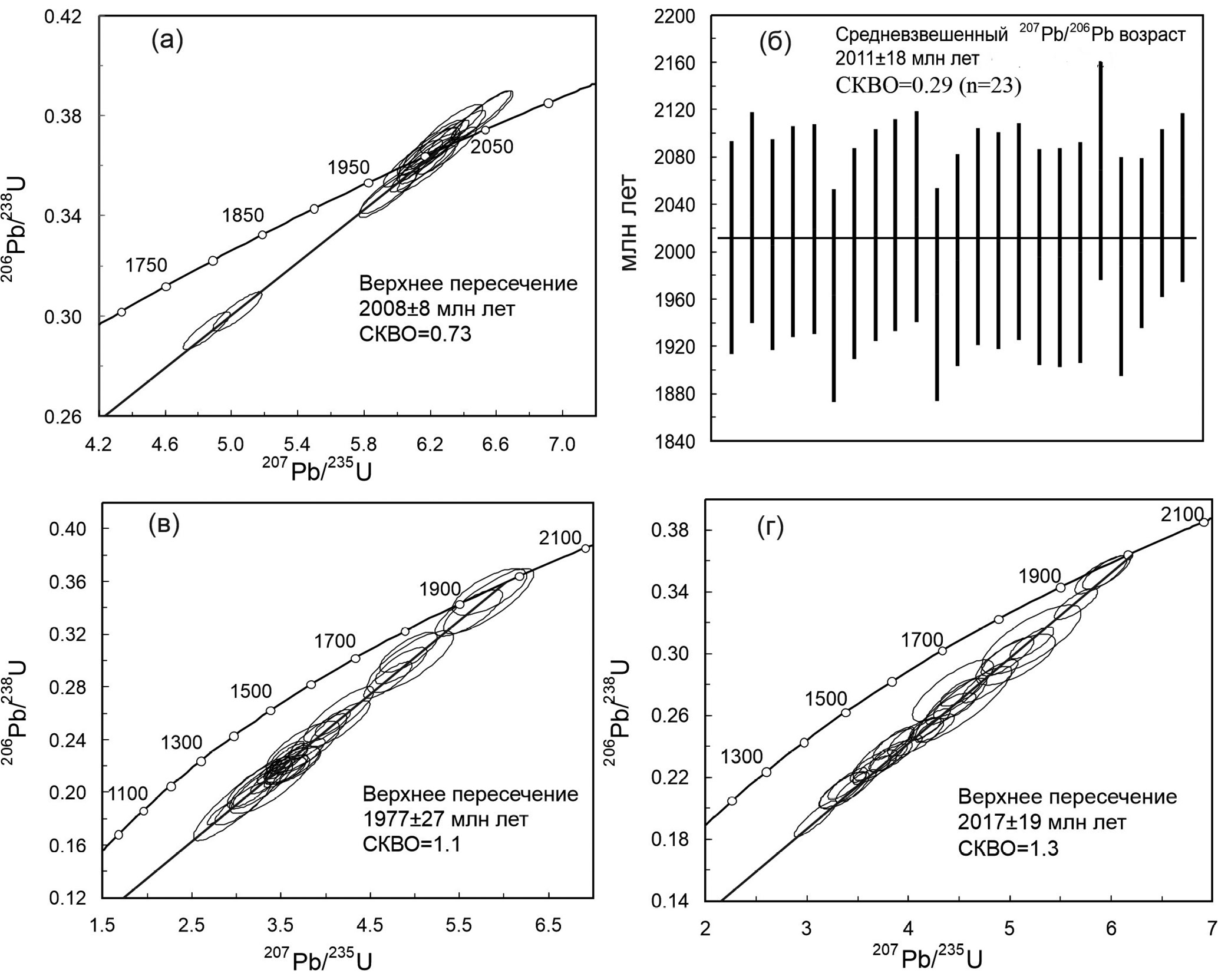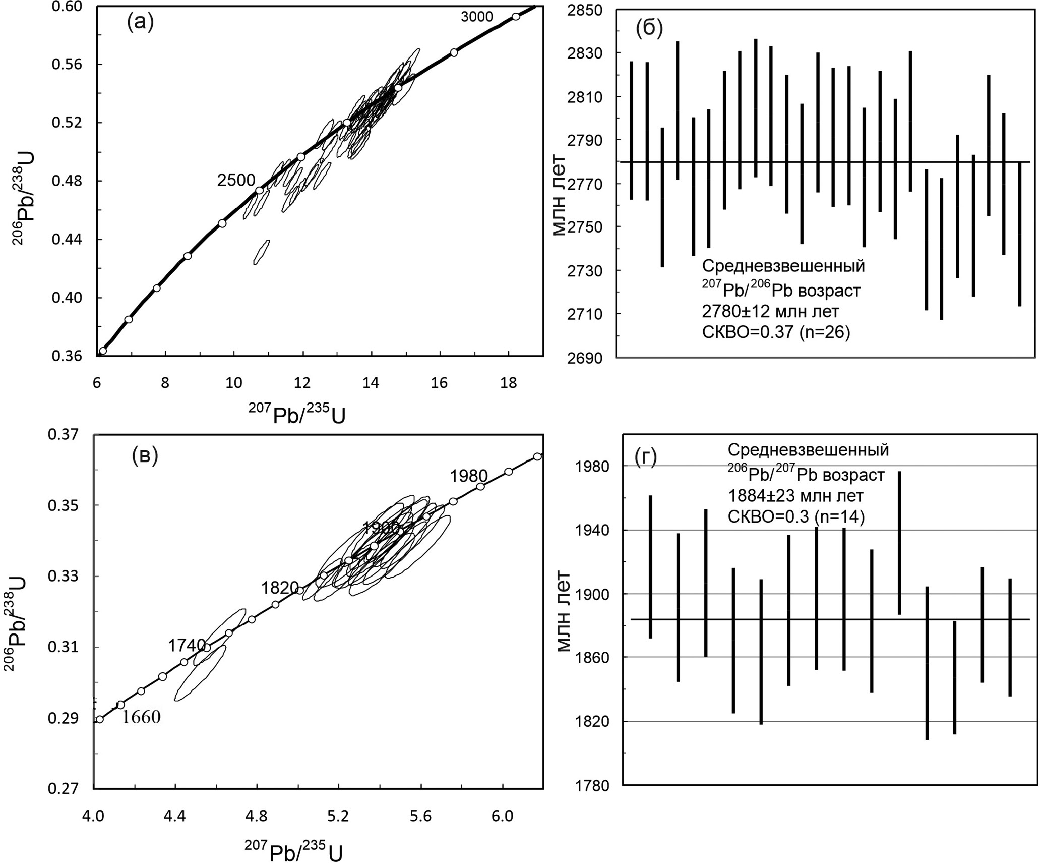 Результаты U-Pb датирования позволяют выделить в фундаменте Непско-Ботуобинской антеклизы три этапа гранитоидного магматизма: ∼2.8, 2.0 и 1.88 млрд лет. К первому этапу относится формирование магматического протолита гнейсов из скв. Ял-4. Как показано выше, цирконы из гнейсов дают ассиметричный пик на кривой вероятности распределения возраста и испытали частичную потерю Pb на рубеже ∼2.53 млрд лет, следовательно наиболее корректной оценкой времени формирования протолита гнейсов служит возраст 12 исследованных наиболее древних кристаллов – 2801 ± 18 млн лет. Расположение точек циркона вдоль конкордии обусловлено малым (∼260 млн лет) интервалом между временем кристаллизации циркона и термальным событием, с которым связано нарушение изотопной системы. Второй этап (∼2.0 млрд лет) представлен образованием гнейсогранитов из скв. Дн-532 с возрастами 2007 ± 4, 2017 ± 19 и 1977 ± 27 млн лет, которые перекрываются в пределах ошибки. С третьим этапом связано образование биотитовых гранитов из скв. Сн-1, имеющих возраст 1884 ± 23 млн лет.