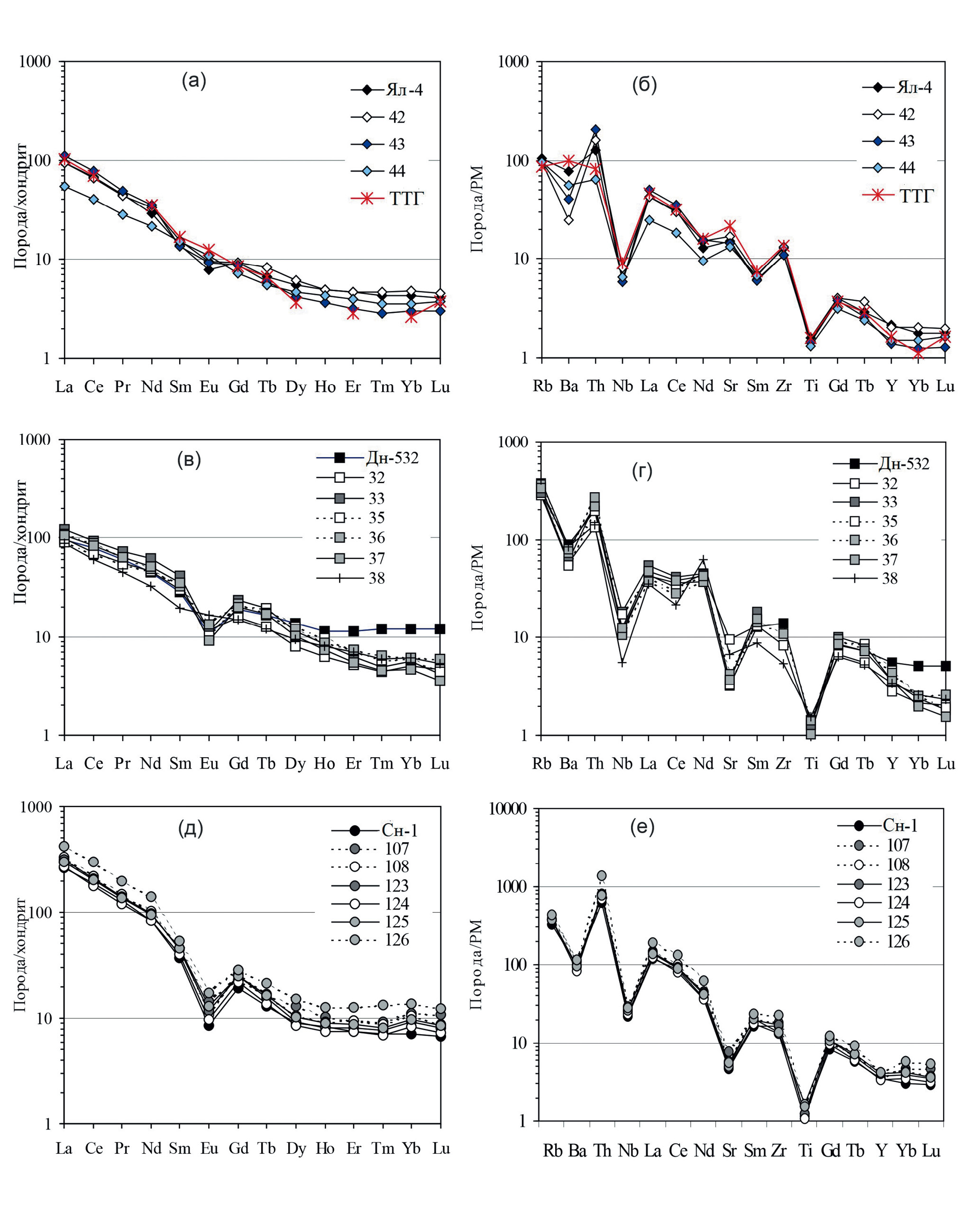 Содержания главных элементов в породах определены в Центре коллективного пользования многоэлементных и изотопных исследований СО РАН (ЦКП МИИ СО РАН, г. Новосибирск) рентгенофлюоресцентным методом на спектрометре ARL-9900 XL. Содержание редких элементов в трех реперных образцах (Ял-4, Дн-532 и Сн-1) определены в ЦКП МИИ СО РАН методом ICP-MS на масс-спектрометре высокого разрешения ELEMENT (Finnigan Mat) с ультразвуковым распылителем U-5000AT+ по методике (Николаева и др., 2008). На стадии химической подготовки образцов использовали сплавление с особо чистым метаборатом лития при 1050°С в платиновых тиглях с последующим растворением полученного сплава в разбавленной азотной кислоте. Для обеспечения стабильности полученного раствора поддерживали общую кислотность на уровне 5% HNO3 и добавляли следовые количества HF, что необходимо для корректного определения высокозарядных элементов. Сплавление при высокой температуре обеспечивает разложение практически всех наиболее трудновскрываемых минералов, которые могут быть концентраторами редкоземельных и высокозарядных элементов, а повышение кислотности и добавки HF в качестве комплексообразователя стабилизируют эти растворы и минимизируют потери высокозарядных элементов, которые могут происходить в результате гидролиза при низкой кислотности. Пределы обнаружения редкоземельных и высокозарядных элементов составляют от 0.005 до 0.1 г/т; точность анализа – в среднем 2–5 отн. %.
