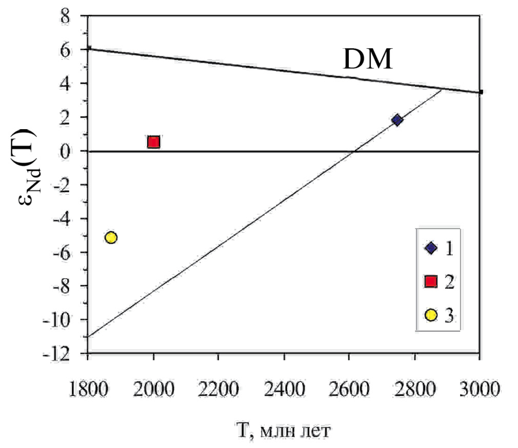 В отличие от гнейсов и гнейсогранитов биотитовые граниты из скв. Сн-1 это преимущественно известково-щелочные и железистые гранитоиды, обогащенные легкими REE, Th, Nb, т. е. сопоставимые с гранитами А-типа. Следует отметить, что в целом в составе Южно-Сибирского пояса среди постколлизионных гранитоидов с возрастом 1.88–1.84 млрд лет доминируют граниты А-типа (Туркина, Капитонов, 2019; Donskaya, Gladkochub, 2021). Формирование гранитов А-типа рассматривается в рамках плавления коровых кварц-полевошпатовых субстратов или плавления/дифференциации мафических источников (Frost, Frost, 2011). Исследованные граниты не имеют повышенных концентраций Ba и Sr, типичных для гранитов А-типа монцонитового ряда, а высокие концентрации легких REE и Th, скорее, свидетельствуют в пользу плавления кварц-полевошпатового источника. Изотопный состав гранитов не отвечает линии эволюции мезоархейской коры (рис. 10), представленной гнейсами, изотопные параметры гранитов (εNd(T) = –5.1 и TNd(DM) = 2.5 млрд лет) предполагают их образование за счет плавления либо неоархейской коры, либо более древнего корового источника при участии ювенильного палеопротерозойского материала.