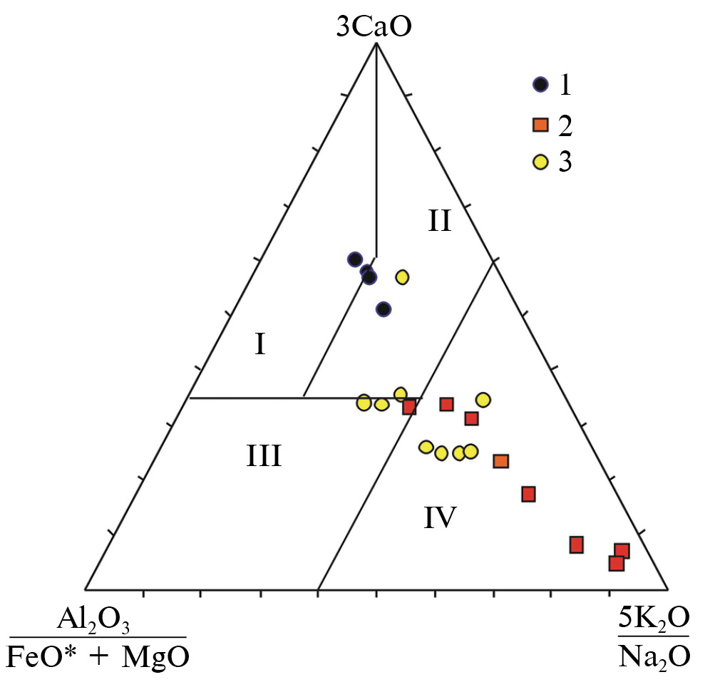 Рис. 11. Диаграмма Al2O3/(FeO*+MgO)–3CaO–5K2O/Na2O для раннедокембрийских гнейсов и гранитоидов фундамента (НБА). 1 – гнейсы (скв. Ял-4), 2 – гнейсограниты (скв. Дн-532), 3 – граниты (скв. Сн-1). Поля источников (Laurent et al., 2014): I – низко- и II – высококалиевых мафических, III – тоналитовых, IV – метаосадочных.