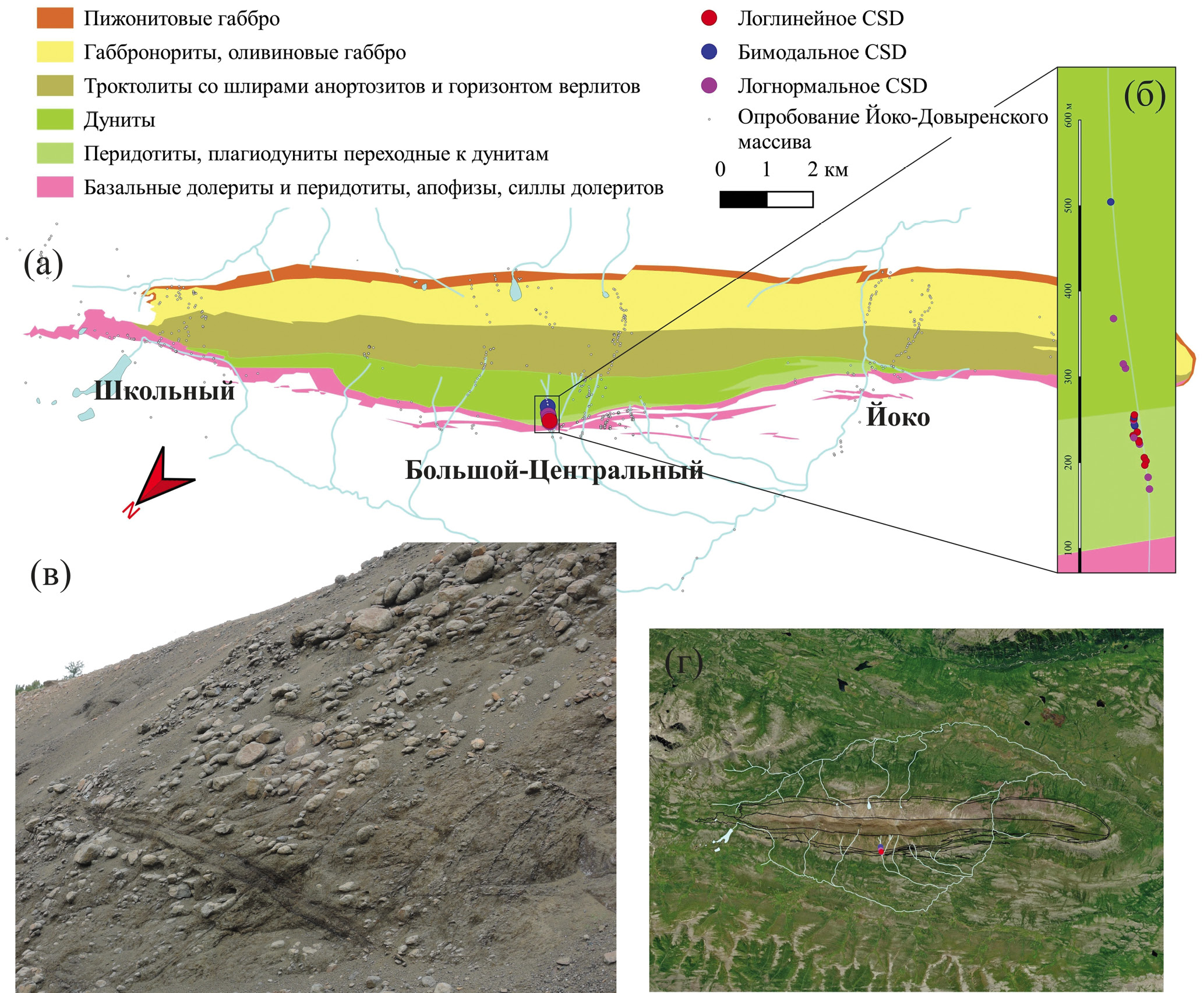 Рис. 1. (а) Упрощенная геологическая схема Йоко-Довыренского массива, по (Ariskin et al., 2018). Жирным шрифтом указаны названия трех основных разрезов. На врезке (б) даны положения точек пробоотбора, в том числе приведены образцы, классифицированные без инструментального определения CSD, но визуально, и на основании геохимических данных (Ariskin et al., 2018) отнесенные нами к одному из трех типов. Линейка отложена от нижнего контакта массива. (в) Характерный склон долины руч. Большой, где обнажается нижняя часть разреза дунитов. Видно, что обнаженность хотя и коренная, но не непрерывная. (г) Спутниковый снимок с контурами массива.