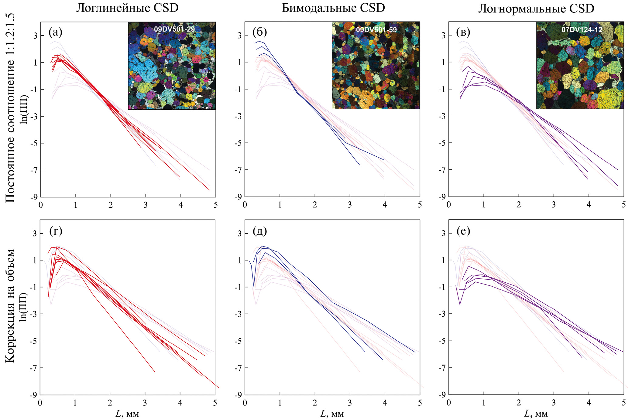 Учитывая экспериментальные работы (Schiavi et al., 2009; Ni et al., 2014) и наблюдения за кристаллизацией лавовых озер (Cashman, Marsh, 1988), можно сделать предположение, что первичные ростовые распределения при простом естественном охлаждении обычно имеют логлинейную форму CSD (рис. 4а), даже при разных режимах кристаллизации как в закрытой, так и в отрытой системах. При этом более аргументированной кажется позиция, что тепловой поток из системы на основном этапе кристаллизации убывает, а ядра кристаллов растут при большем переохлаждении, чем периферийные части. Окончательно в каждом конкретном случае, этот вопрос должен решаться с привлечением дополнительных структурных аргументов, например, зональности по несовместимым элементам, таким как фосфор или алюминий.