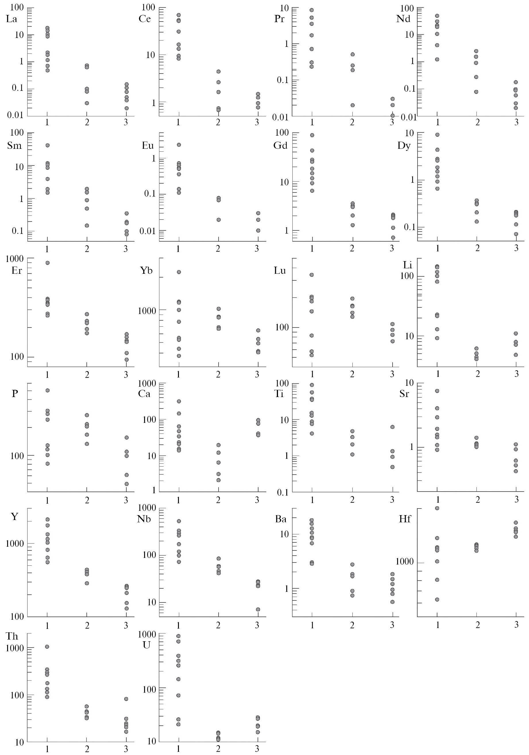 Рис. 6. Закономерности изменения содержаний микроэлементов (г/т) в цирконе первой (1), второй (2) и третьей (3) генераций.