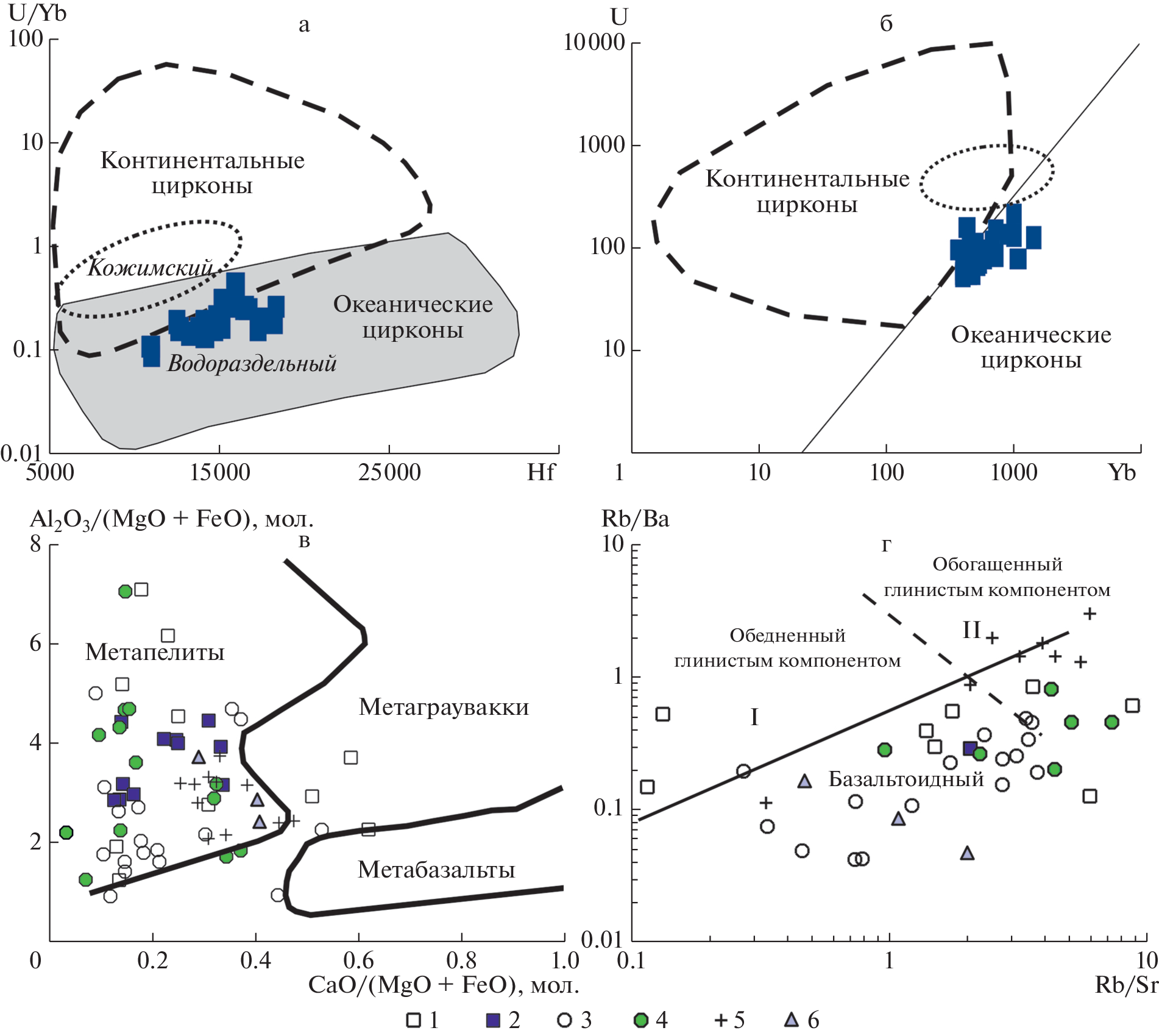 Petrogeochemical features of the Vodorazdelny massif granites (Subpolar Urals, Lyapinsky anticlinorium) indicate these rocks are close to I-granites and were formed in suprasubduction environment. The ratios of the key elements (Rb, Ba, Th, Sr, Y, Nb) suggest that the basites of the melting slab and the fluid separated during their dehydration could participate in the granite generation. The U–Pb age of the main population of magmatogenic zircons is 593 ± 4 Ma and corresponds to the Vendian (Ediacarian). It coincides with the age of the granites from the nearby Vangyr massif (598 ± 5 Ма), as well as with the age of zircon cores from the granites of the Kozhim massif located to the north. Values of εHf(t) from –2 to 0 in magmatogenic zircons with an age corresponding to the age of Vodorazdelny granites indicate a heterogeneous source of melts. The zircons of these granites also contain ancient cores with U–Pb ages from 2200 to 700 Ma, where the values of εHf(t) from +0.8 to +13 indicate the presence of a crust component in the substrate (the substance of the ancient platform basement). Petrogeochemical and isotope-geochronological parameters of granites (and their zircons) do not confirm the validity of attributing of Vodorazdelny granite massif (and its analogues – the Vangyr and Kozhim massifs) to the Cambrian Salner-Mankhambo complex. We consider there are the possibility of separating of independent complex (about 598 Ma, Vendian?) during geological mapping. The presence in the Lyapinsky anticlinorium of several stages of granite generation (Middle Riphean–Vendian–Cambrian), accompanied by metamorphism, and complicate composition of ancient metamorphic strata from this structure basement led to varying isotopic parameters characterizing the heterogeneity of the source of melts, on the one hand, and the convergence of a number of geochemical features, on the other.