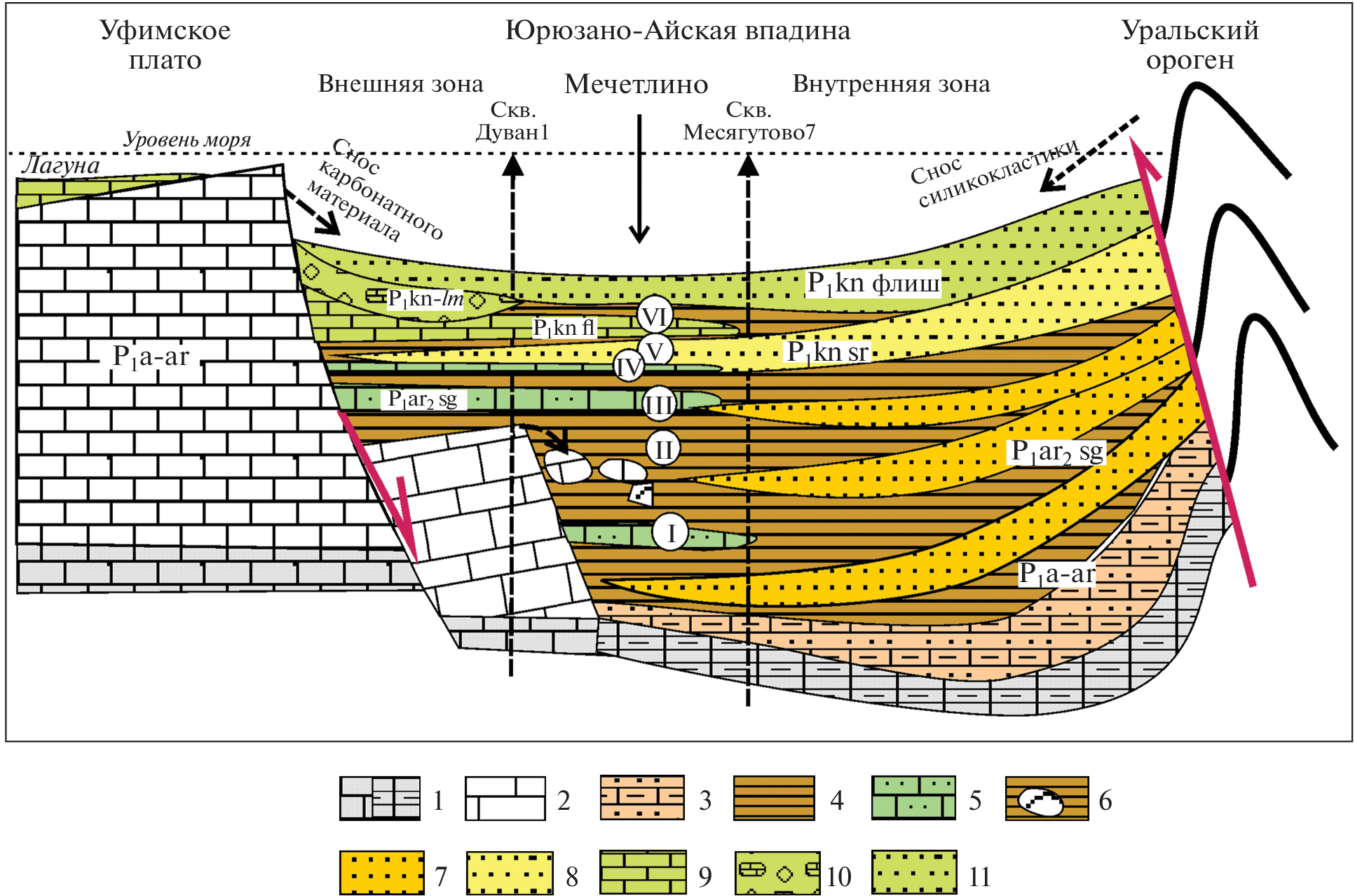 A lithofacies and bionomic study of the boundary Artinskian-Kungurian deposits of the Cisuralian Series of the Permian system in the Yuryuzan-Ai Depression was carried out on the example of the Mechetlino section (Southern Urals). The section was a candidate GSSP of the lower boundary of the Kungurian. In terrigenous-carbonate deposits, eight lithophacial types of rocks – lithofacies – are identified. According to their combination, the section is divided into packages composed of carbonate-terrigenous flysch rocks, carbonate clastic deposits initiated by storms, and blocky underwater landslide deposits. Six ecological complexes of small foraminifera are identified, reflecting sedimentation conditions in the areas of benthic fauna denudation. The mechanisms of mixing and movement of plant remains, benthic, planktonic and nectonic fossils are indicated. A model of the formation of sedimentary complexes of the Lower Permian in the Yuryuzan-Ai depression of the Pre-Ural trough is proposed, reflecting the bionomic specificity of the complexes of organic residues on the border of the Artinskian and Kungurian stages.