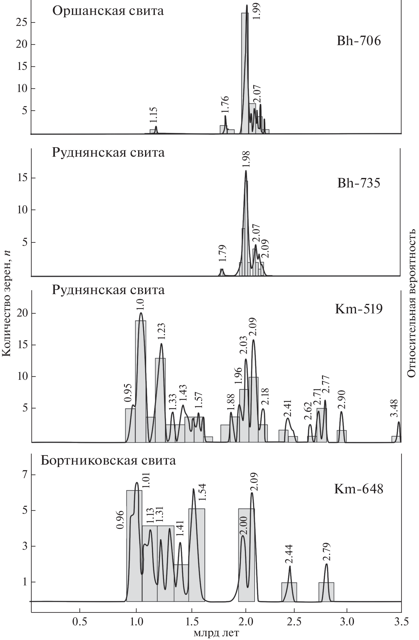 Geochronological U–Th–Pb LA-ICP-MS study of detrital zircon grains from Riphean sandstones of the Sherovichi and Belarus series of the Orsha part of the Volyn-Orsha paleotrough (boreholes Korma and By-khov, Belarus) was carried out. The received U–Th–Pb geochronological data indicate that the primary provenance of zircon was crystalline rocks of predominantly Early and Middle Riphean, as well as Early Proterozoic and Archean age. The presence of detrital zircon grains with an age of 1 Ga in the sandstones of the Sherovichi and Belarus series, which were previously considered Middle Riphean, evidences that these sequences are of Late Riphean age. A representative population of grains with an age of about 1 Ga was detected only in the rocks of the Korma borehole, whereas in sandstones from other boreholes located within the Voly-n-Orsha trough (borehole 70, borehole Vilchitsy 1 and borehole Bykhovskaya), it is absent. This indicates that a possible primary provenance of zircon could be located both within the paleotrough and at a considerable distance, within the Grenville Sweconorwegian orogen.