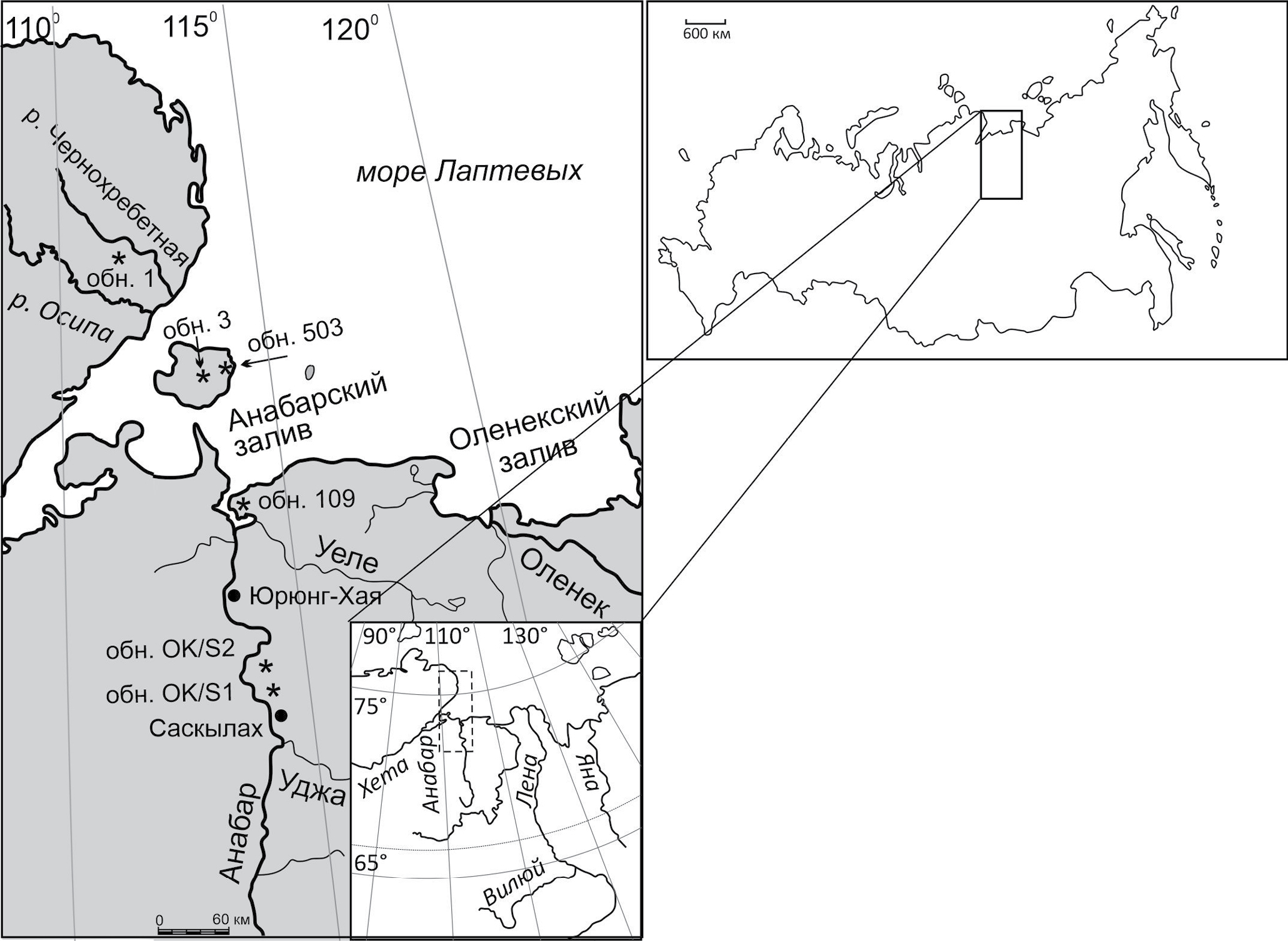 Pека Анабар. В одной из недавних работ по юре Анабарского района подробно проиллюстрирована эволюция взглядов на зональное расчленение местных келловейских разрезов (Никитенко и др., 2022, рис. 3). Выходы на поверхность юрских пород известны на правом берегу р. Анабар, между устьями рек Средняя и Содиемыха (рис. 1), где на протяжении 24 км они характеризуются значительной фациальной изменчивостью. В сводном разрезе (Стратиграфия…, 1976) к зоне Subordinarium отнесена пачка 39 глауконитового песчаника мощностью 1.6 м (обн. 8). В основании пачки — линзовидные скопления гальки, заключающие куски древесины и стволы до 0.2–0.3 м в поперечнике. Возможно, из этого местонахождения происходит экземпляр Eboraciceras subordinarium (Князев и др., 1973, рис. 1, фиг. 2, экз. № 489-1), который был изображен без точной стратиграфической привязки.
