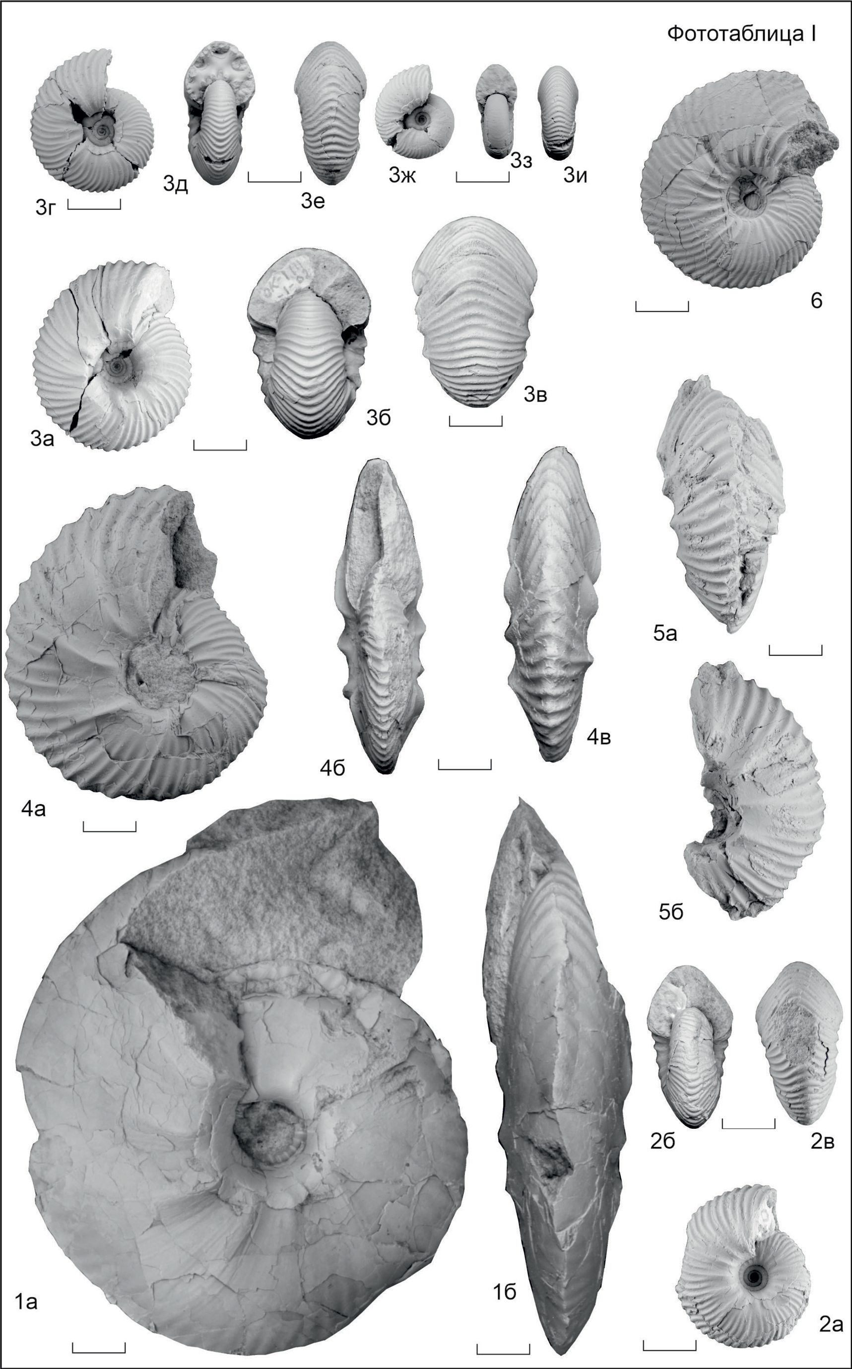 1, 4 — Quenstedtoceras nikitinianum (Lahusen, 1883): 1а, 1б — экз. № 2060/100, 1а — вид сбоку, 1б — вид с вентральной стороны; 4а–4в — экз. № 2060/101: 4а — вид сбоку, 4б — вид со стороны устья, 4в — вид с вентральной стороны; р. Анабар, обн. OK/S2, слой 3, 0.4 м выше подошвы, нижний оксфорд, зона Cardioceras obliteratum–Cardioceras scarburgense; 2–3 — Cadoquenstedtoceras sp. juv: 2а–2в — экз. № 2060/10: 2а — вид сбоку, 2б — поперечное сечение, 2в — вид с вентральной стороны; 3а–3з — экз. № 2060/11, 3а, 3г, 3ж — вид сбоку, 3б, 3д, 3з — поперечное сечение, 3в, 3е, 3и — вид с вентральной стороны; р. Анабар, обн. OK/S1, слой 2, 0.2 м выше подошвы, верхний келловей, слои с Cadoquenstedtoceras begichevi; 5 — Cadoquenstedtoceras begichevi Knyazev et Alifirov: 5а–5б — экз. № 2060/12, 5а — вид сбоку, 5б — вид с вентральной стороны; р. Анабар, обн. OK/S1, слой 2, 0.2 м выше подошвы, верхний келловей, слои с Cadoquenstedtoceras begichevi; 6 — Scarburgiceras scarburgense (Young et Bird, 1828), экз. № 2060/13, вид сбоку (образец полностью сдавлен); р. Анабар, обн. OK/S2, слой 3, 0.4 м выше подошвы, нижний оксфорд, зона Cardioceras obliteratum–Cardioceras scarburgense
