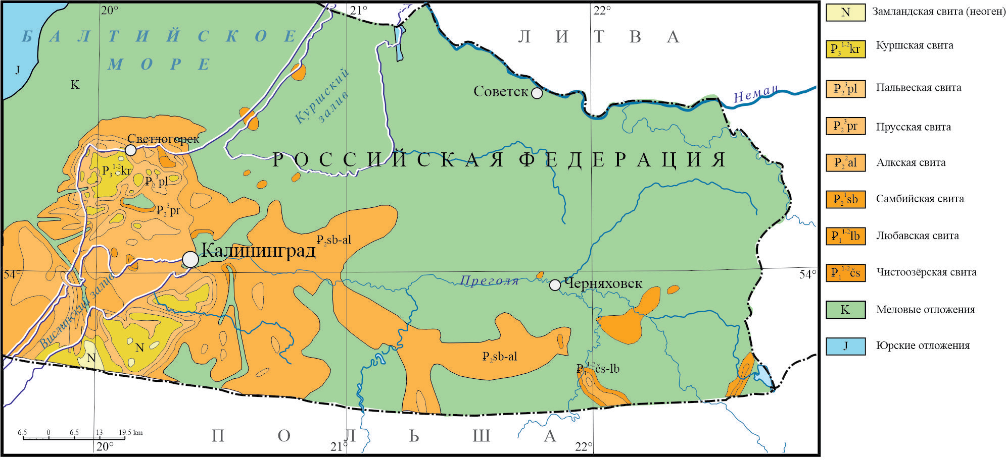 Палеогеновые отложения достаточно широко распространены на территории современной Южной Прибалтики, включающей Калининградскую область (рис. 1) и Южную Литву. В тектоническом плане Калининградская область находится в пределах юго-восточной части Балтийской синеклизы, являющейся крупной отрицательной структурой на западе Восточно-Европейской платформы. Территория современной Калининградской области, вместе с соседней Юго-Западной Литвой, на протяжении большей части палеогена представляла собой часть палеогенового Польско-Литовского (или Литовско-Белорусского) морского пролива, который, в свою очередь, являлся северо-восточной окраиной Датско-Польского морского эпиконтинентального бассейна как части еще более крупного бассейна Северо-Западной Европы. В течение палеогена в различных частях Балтийской синеклизы как крупного бассейна осадконакопления формировались морские, прибрежные и континентальные отложения, с которыми связаны уникальные залежи янтаря, а также запасы кварцевых песков, фосфоритов, глауконита и т.д. Палеогеновые отложения развиты большей частью на юге Калининградской области и выходят на поверхность только на побережье Самбийского полуострова и небольшой части прилегающего шельфа, а также в промышленном карьере Приморский Калининградского янтарного комбината; на остальной территории палеоген вскрывается только скважинами и залегает на глубине до 280 м. Палеогеновые отложения достигают мощности порядка 190 м, залегают на размытой поверхности верхнего мела (на кампанских мергелях или маастрихтских песчано-алевритовых известковых породах) и перекрываются либо неогеновыми, либо четвертичными породами.