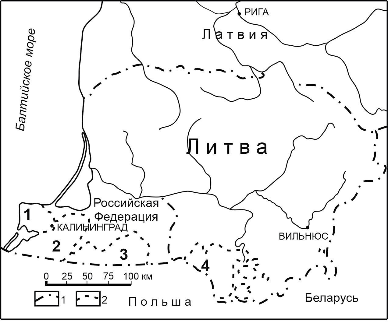 1 — Самбийский полуостров; 2 — юго-западная часть Калининградской области; 3 — юго-восточная часть Калининградской области; 4 — южная часть Литвы