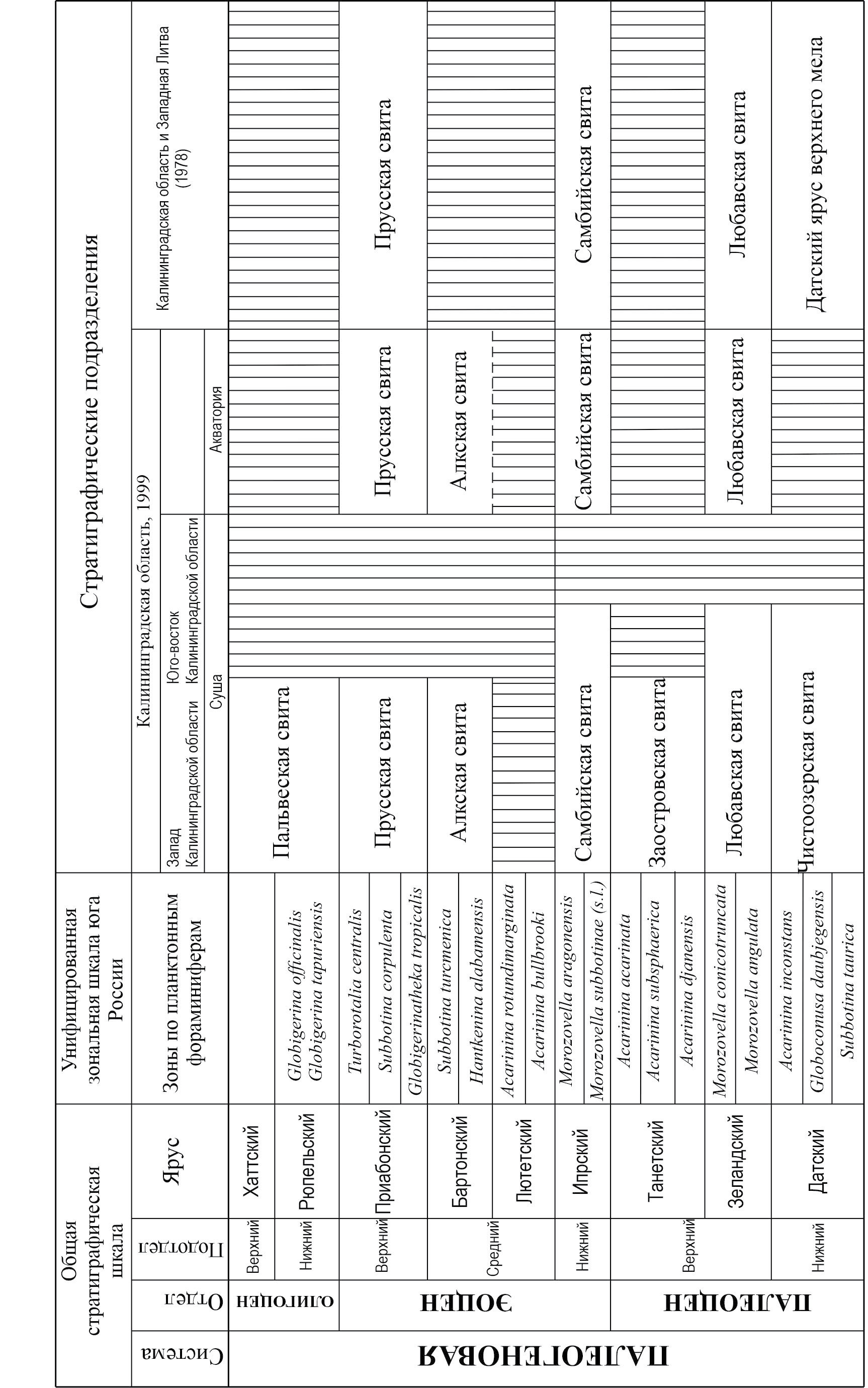 Произошедшие за последние 30 лет изменения в стратиграфическом расчленении палеогена на международном уровне, а также полученные за последние 15 лет новые биостратиграфические данные из части палеогеновой последовательности Калининградской области требуют переработки как унифицированной региональной схемы 1978 г., так и схемы, предложенной В.А. Загородных, А.В. Довбней и В.А. Жамойдой в 2001 г. Дополнительной проблемой, которая возникла в последние годы, является утрата керна из стратотипов большей части палеогеновых свит области.