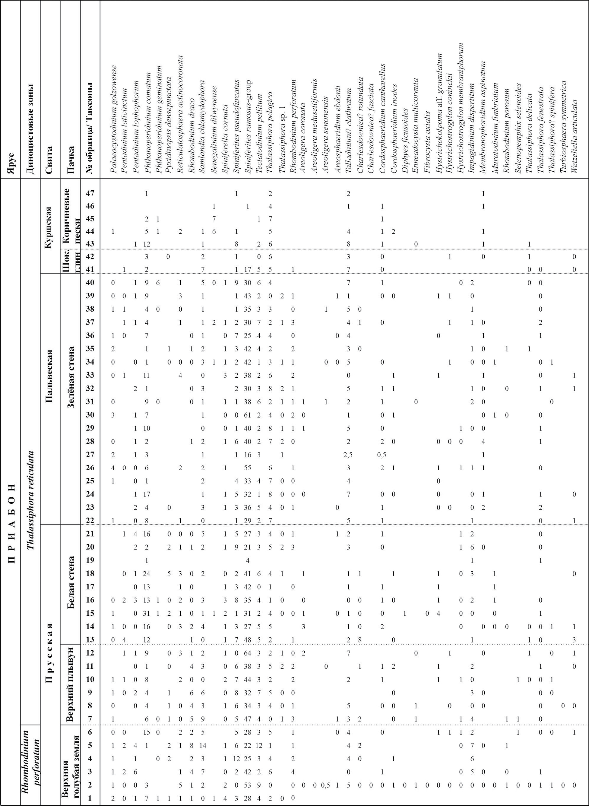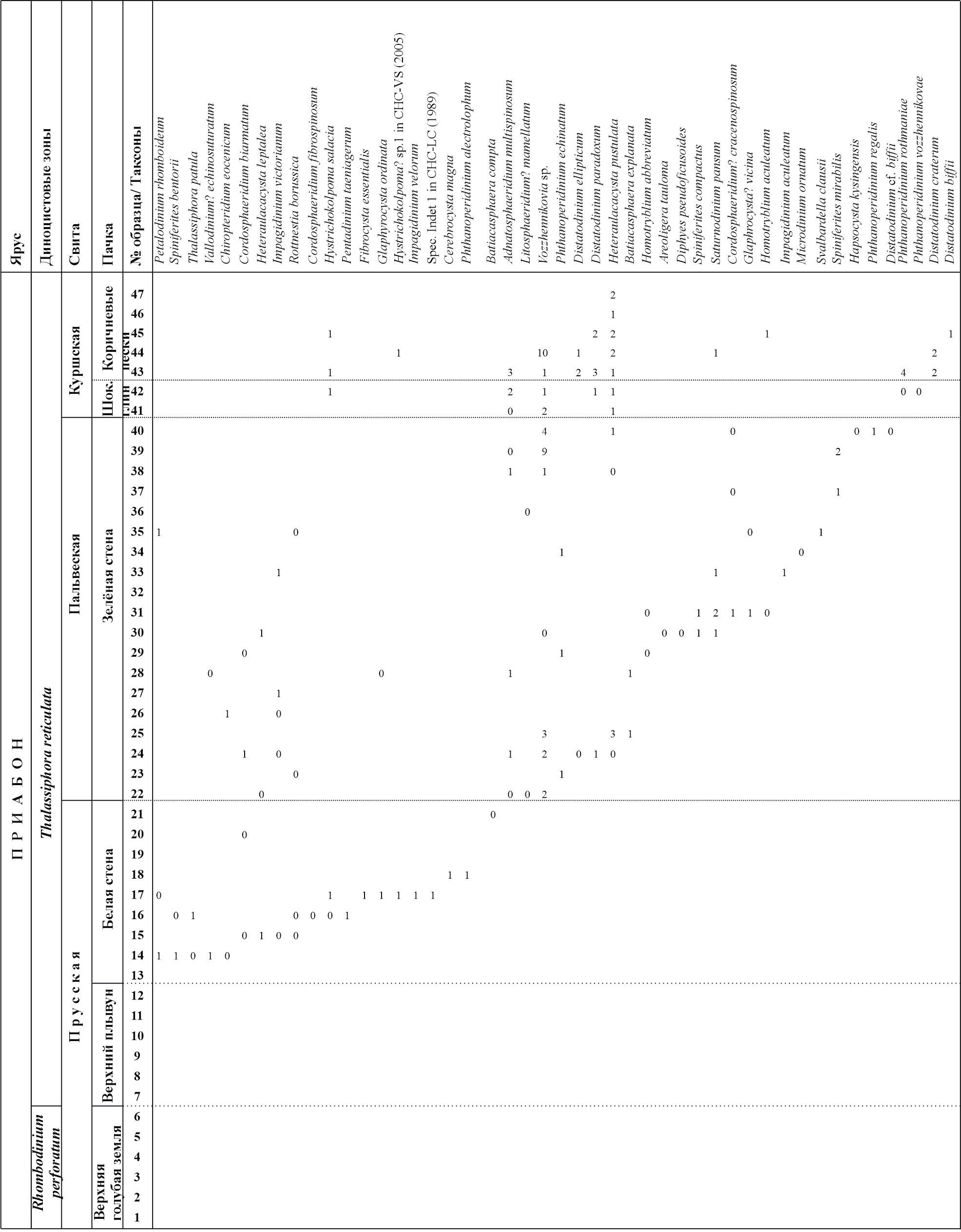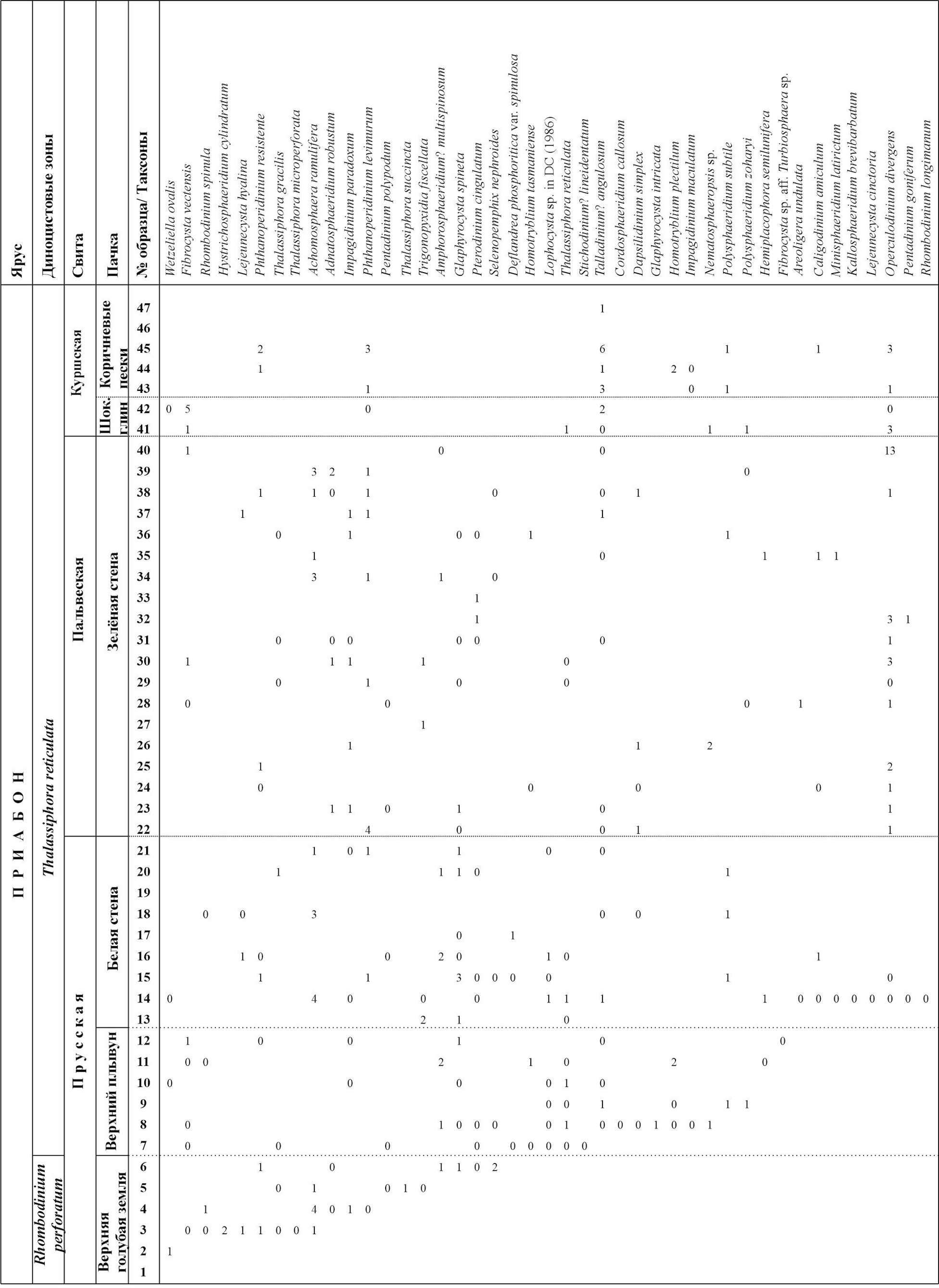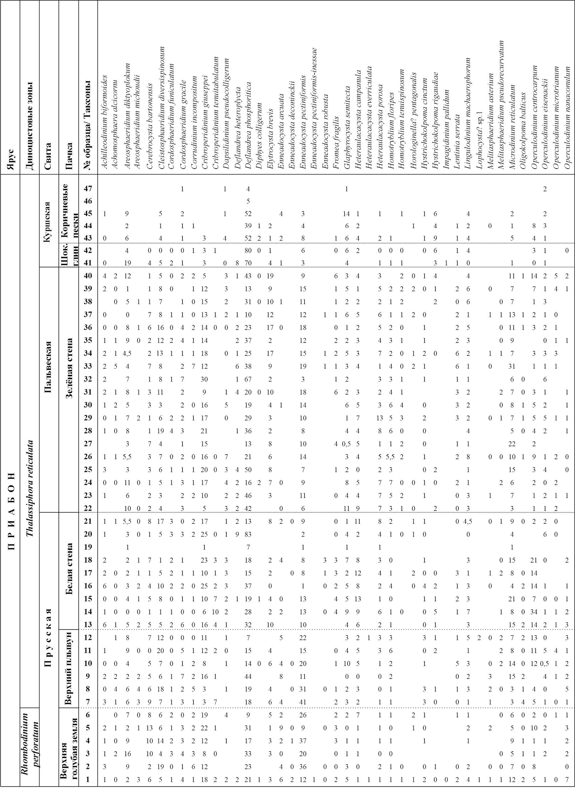 В последнее время были получены новые палинологические данные из отложений куршской свиты в ее стратотипическом разрезе в карьере Приморский Калининградского янтарного комбината (Iakovleva et al., 2021; Кузьмина и др., 2023). Так, в низах свиты в пачке лагунных “шоколадных” глин выявлен комплекс цист динофлагеллат (рис. 6), содержащий более 60 таксонов и включающий, помимо прочего, виды Areosphaeridium diktyoplokum, Glaphyrocysta semitecta и Cordosphaeridium funiculatum, чье присутствие указывает на терминально-эоценовый (конец приабона вблизи границы эоцена–олигоцена) возраст вмещающих отложений. Из всего интервала лагунных и континентальных отложений куршской свиты выделена последовательность из четырех спорово-пальцевых комплексов (Кузьмина и др., 2023):
