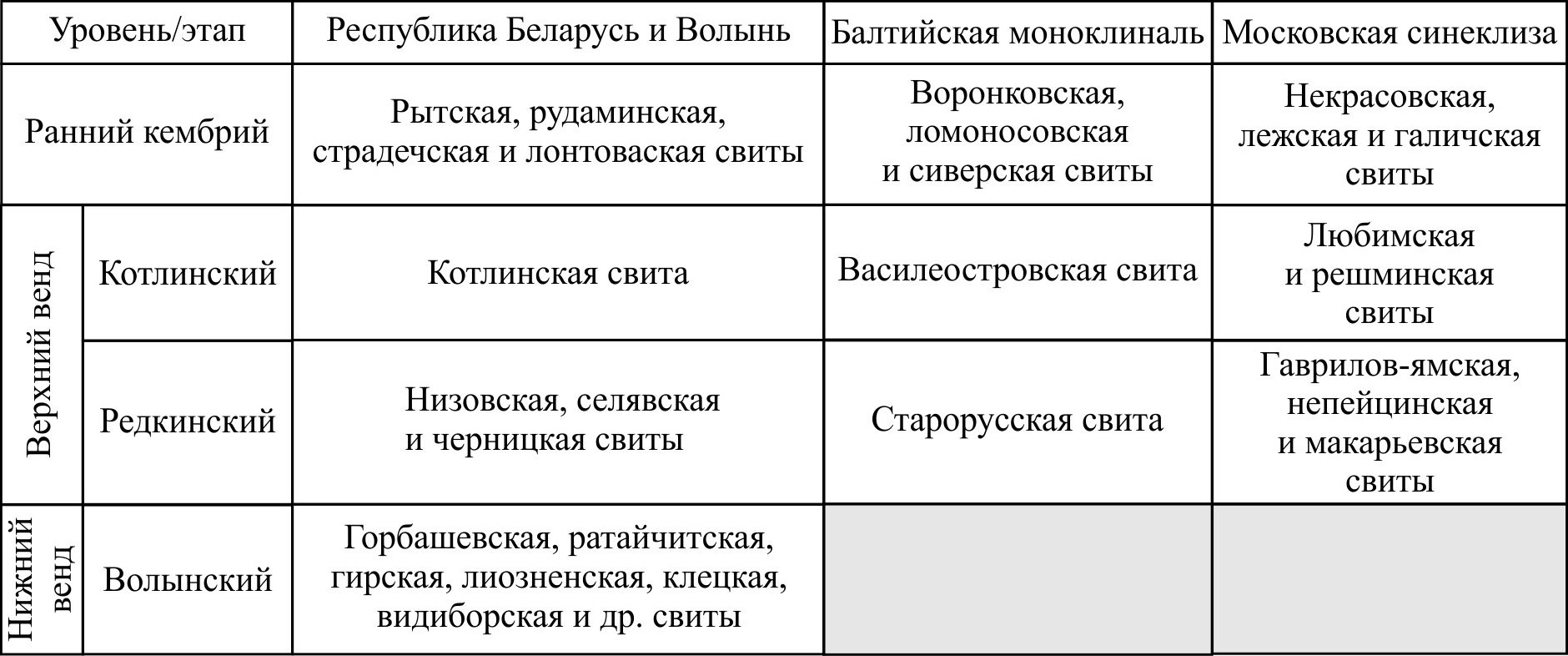Рис. 2. Основные литостратиграфические подразделения волынского, редкинского, котлинского и нижнекембрийского уровней рассматриваемых в настоящей работе регионов. Серый фон — отсутствие отложений