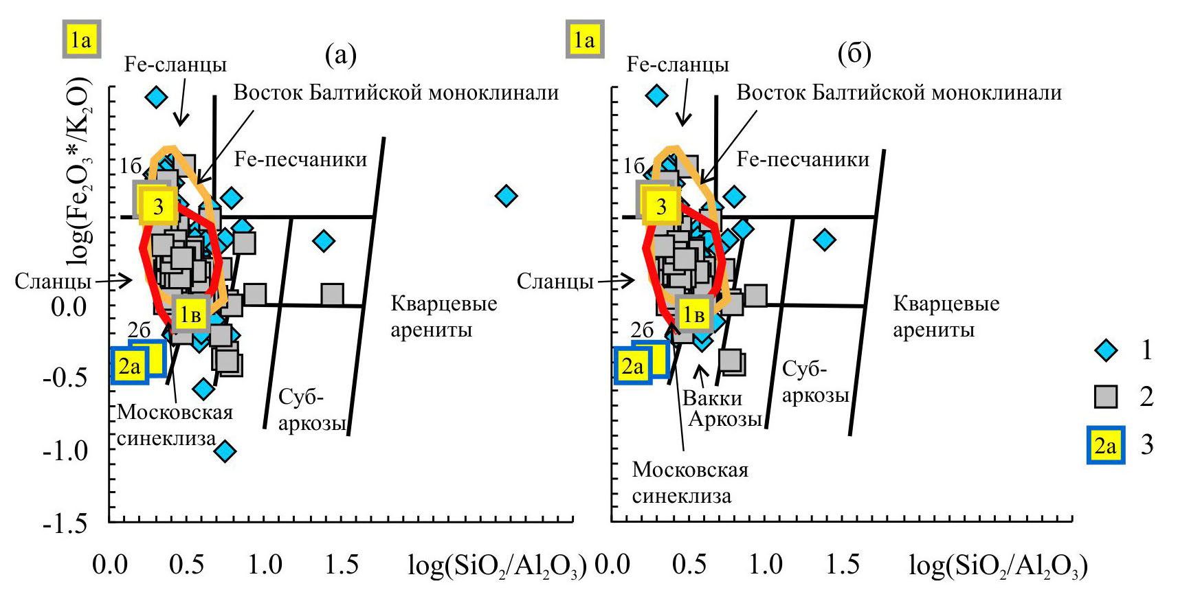 Рис. 3. Положение фигуративных точек состава всех аргиллитов из работы (Jewuła et al., 2022) на диаграмме log(SiO2/Al2O3)–log(Fe2O3*/K2O) (а) и аргиллитов той же выборки с содержанием SiO2 < 66 мас.% (б)