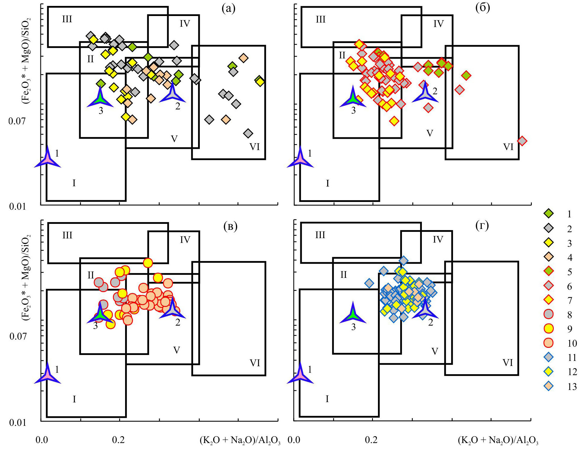 Рис. 4. Положение фигуративных точек аргиллитов волынского (1, 5), редкинского (2, 6, 8, 11), котлинского (3, 7, 9, 12) и нижнекембрийского (4, 10, 13) стратиграфических уровней/этапов Западной Беларуси и Волыни (а), Восточной Беларуси (б), востока Балтийской моноклинали (в) и Московской синеклизы (г) на диаграмме (K2O + Na2O)/Al2O3–(Fe2O3* + + MgO)/SiO2