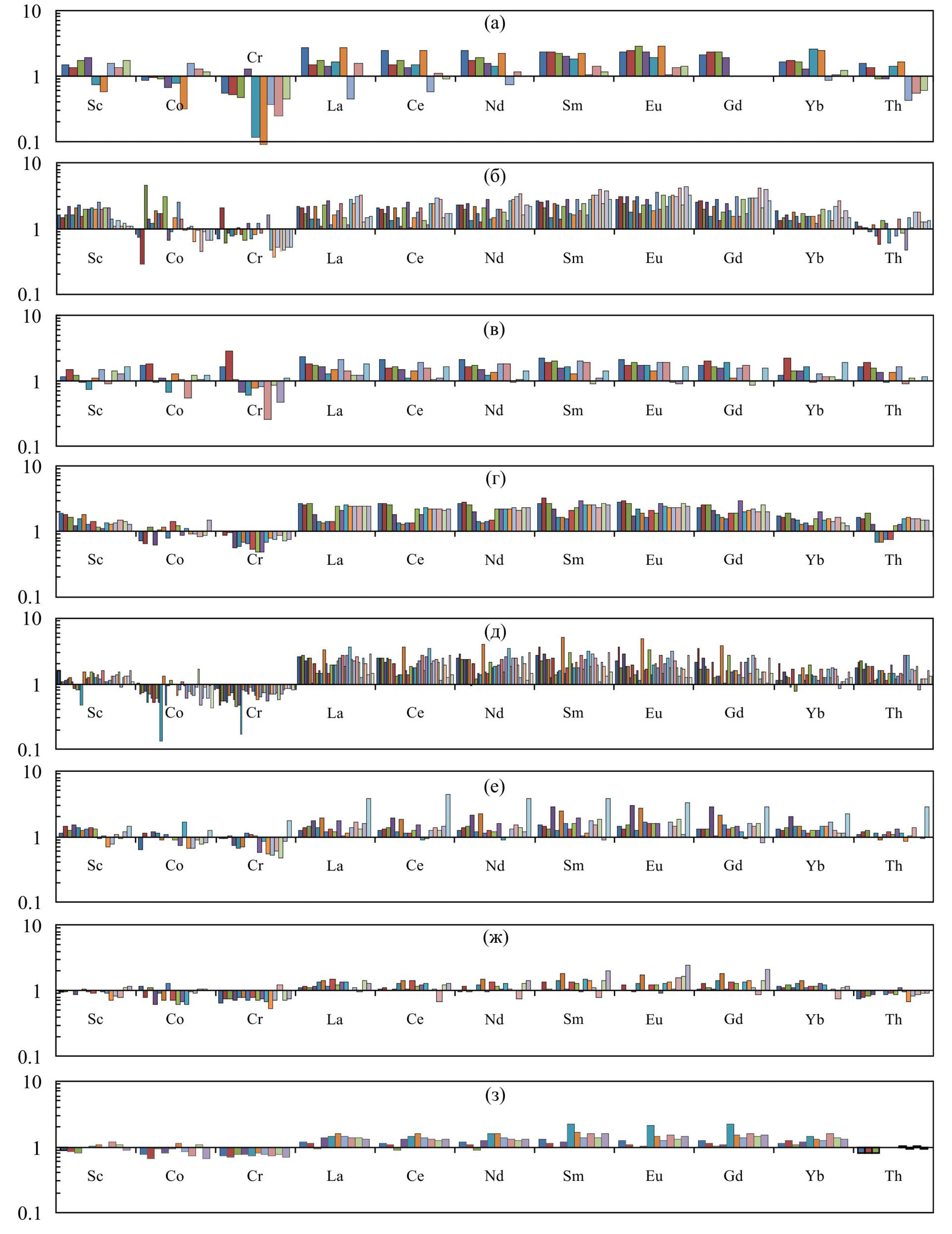 Накопление отложений венда и нижнего кембрия во всех рассматриваемых нами в данной работе регионах происходило в аллювиальных конусах выноса, русловых и пойменных зонах, на приливно-отливных и болотно-лагунных равнинах, а также в прибрежно- и мелководно-морских обстановках (открытые части крупных заливов, верхний шельф и т.п.) (Подковыров и др., 2017; Jewuła et al., 2022; Маслов, Подковыров, 2023). Формирующиеся в перечисленных обстановках осадки в значительной мере наследуют распределение ряда слаборастворимых в воде редких и рассеянных элементов (Th, La, Sc, Co, Cr, Ni, V и др.), существовавшее в породах источников сноса (Taylor, McLennan, 1985; McLennan, 1989; McLennan et al., 1990, 1993; Интерпретация…, 2001; Geochemistry…, 2003; Маслов и др., 2018).