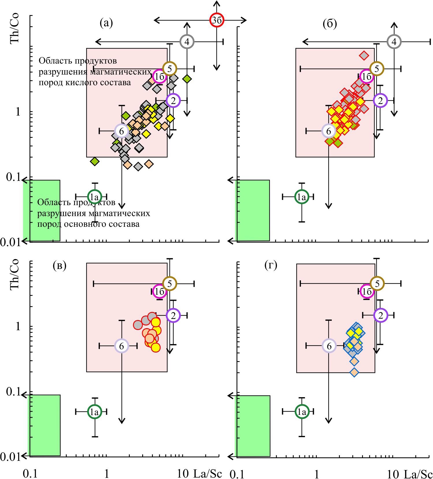 Цифры в кружках — средние точки состава прототипов источников тонкой алюмосиликокластики: 1а — основные породы Волынско-Брестской КМП, 1б — кислые породы той же КМП, 2 — Данополонский ороген, 3а — граниты рапакиви и ассоциирующие с ними породы Украинского щита, 3б — то же северо-запада России и Прибалтики, 4 — Трансскандинавский пояс изверженных пород, 5 — комплексы пород Сарматии с возрастом 2.0–1.8 млрд лет, 6 — свекофенниды Скандинавии, 7 — анортозиты Польши