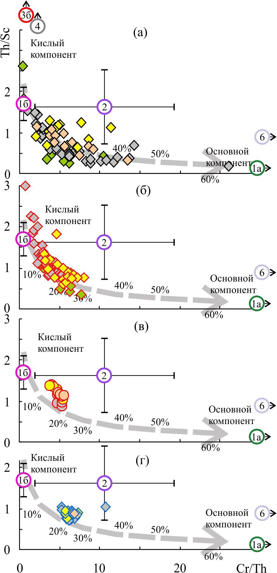 Распределение точек состава глинистых пород венда и нижнего кембрия Западной Беларуси и Волыни на графике Cr/Th–Th/Sc (Condie, Wronkiewicz, 1990; Bracciali et al., 2007) показывает существенные вариации соотношения продуктов размыва основных и кислых магматических пород в аргиллитах волынского и редкинского уровней (рис. 8а). Интересно, что вклад основной алюмосиликокластики выше для глинистых пород редкинского уровня (до 35–40%), тогда как в аргиллитах волынской серии такого материала в целом несколько меньше. Состав глинистых пород котлинского этапа и нижнего кембрия более однороден; доля продуктов размыва магматических пород основного состава составляет в них ~10–30%. Определенные источники тонкой алюмосиликокластики для рассматриваемых нами осадочных последовательностей с помощью данной диаграммы, по-видимому, не могут быть реконструированы, за исключением кислых магматических пород Волынско-Брестской КМП и Данополонского орогена. Глинистые породы волынского этапа Восточной Беларуси содержат от 20 до 30% продуктов размыва магматических пород основного состава (рис. 8б), а аргиллиты верхнего венда — от менее 10 до ~20–25%. Примерно столько же тонкой основной алюмосиликокластики присутствует в глинистых породах верхнего венда и нижнего кембрия востока Балтийской моноклинали и Московской синеклизы (рис. 8в, 8г).