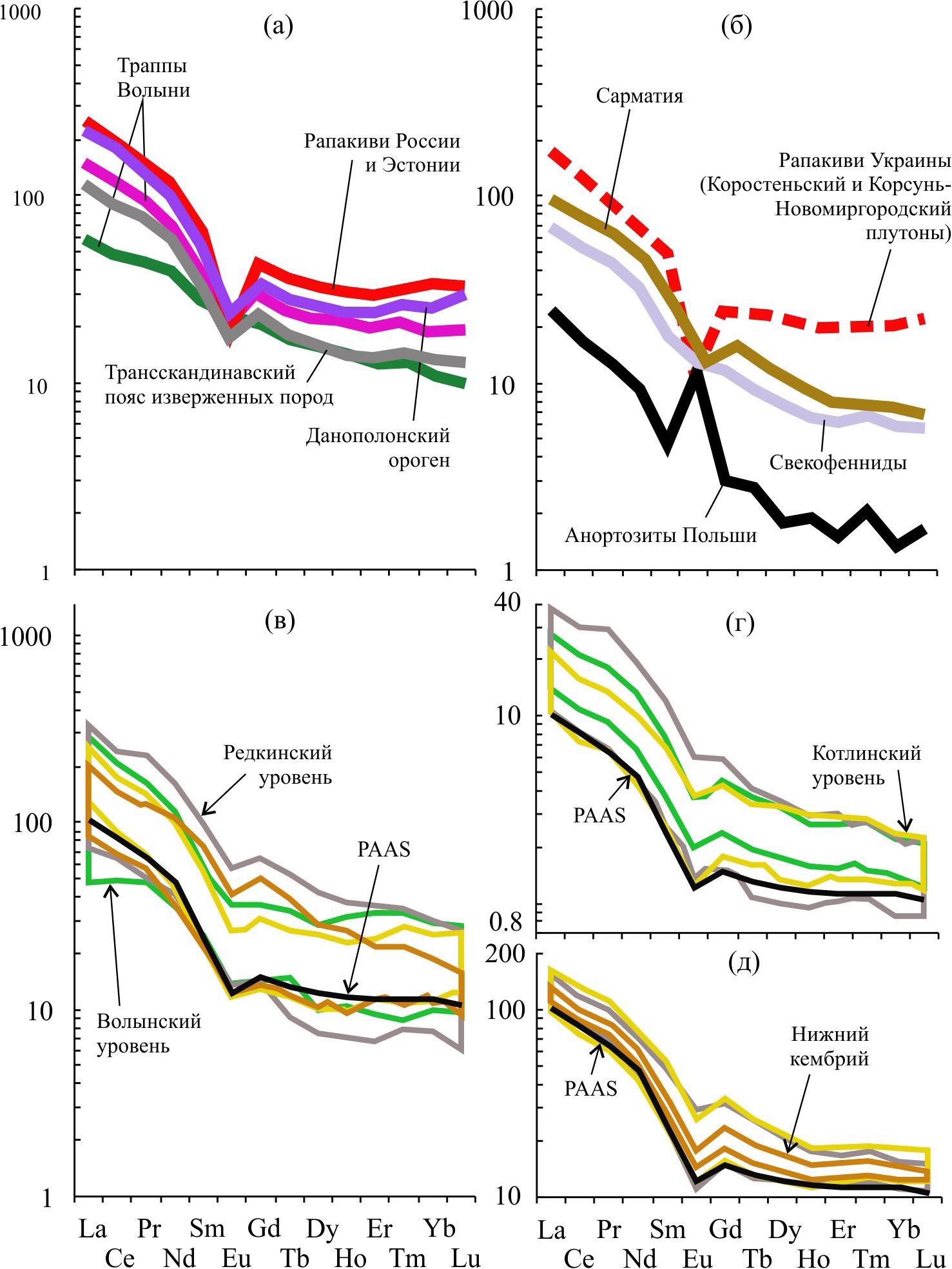 Рис. 10. Средние спектры нормированных к хондриту лантаноидов в прототипах источников тонкой алюмосиликокластики (а, б) для глинистых пород венда и нижнего кембрия Западной Беларуси и Волыни (в), Восточной Беларуси (г) и Московской синеклизы (д)
