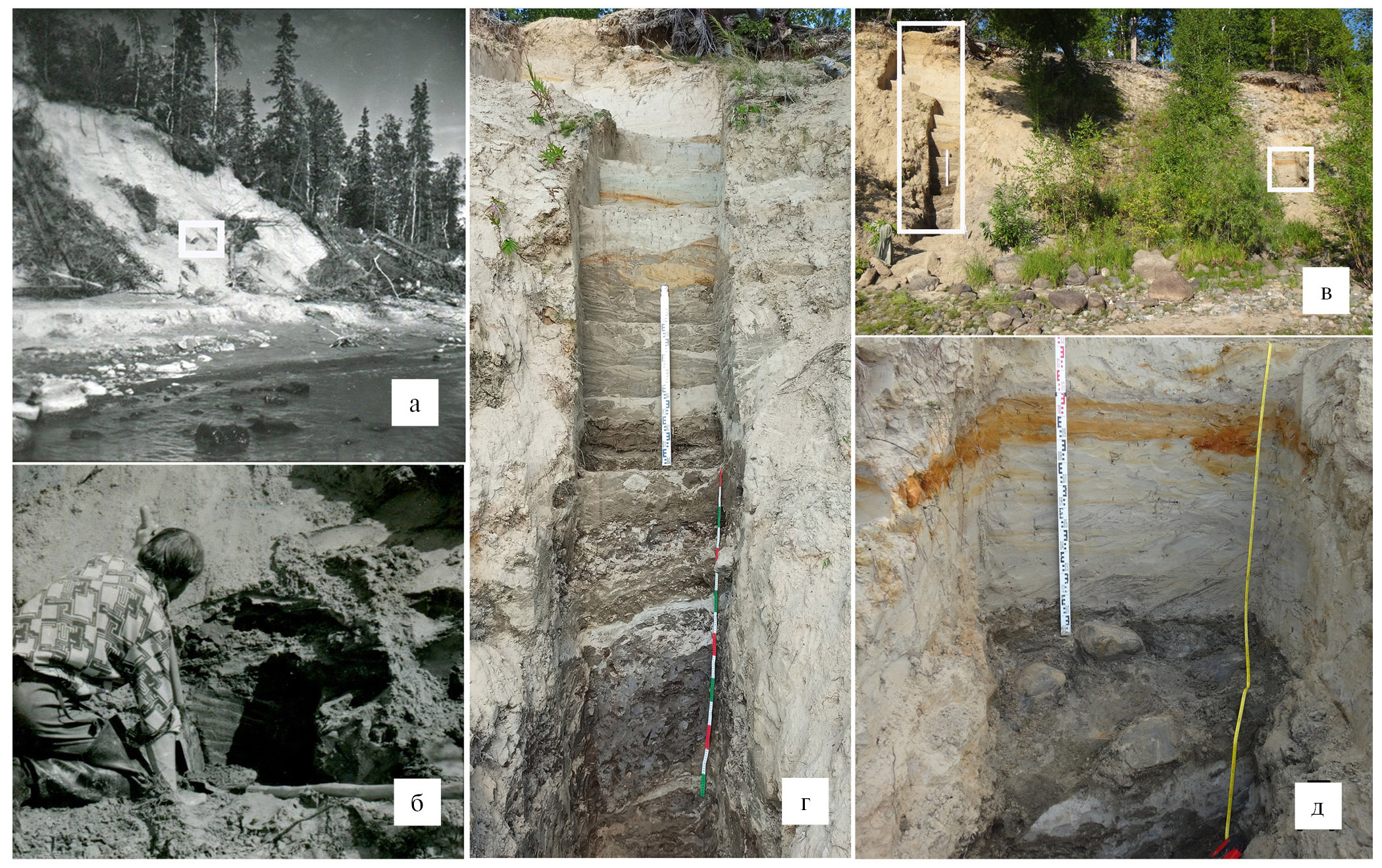 (а) — общий вид местонахождения 430 км в 1981 г., белым прямоугольником обозначено место отбора палеонтологического материала; (б) — место отбора палеонтологического материала из аллювиальных отложений, содержащих ископаемые остатки, 1981 г.; (в) — общий вид местонахождения 430 км в 2021 г., контурами отмечены места расчисток: белый вертикальный прямоугольник — расчистка 1, белый квадрат — расчистка 2; (г) — расчистка 1 местонахождения 430 км, 2021 г.; (д) — расчистка 2, нижняя часть, 2021 г.
