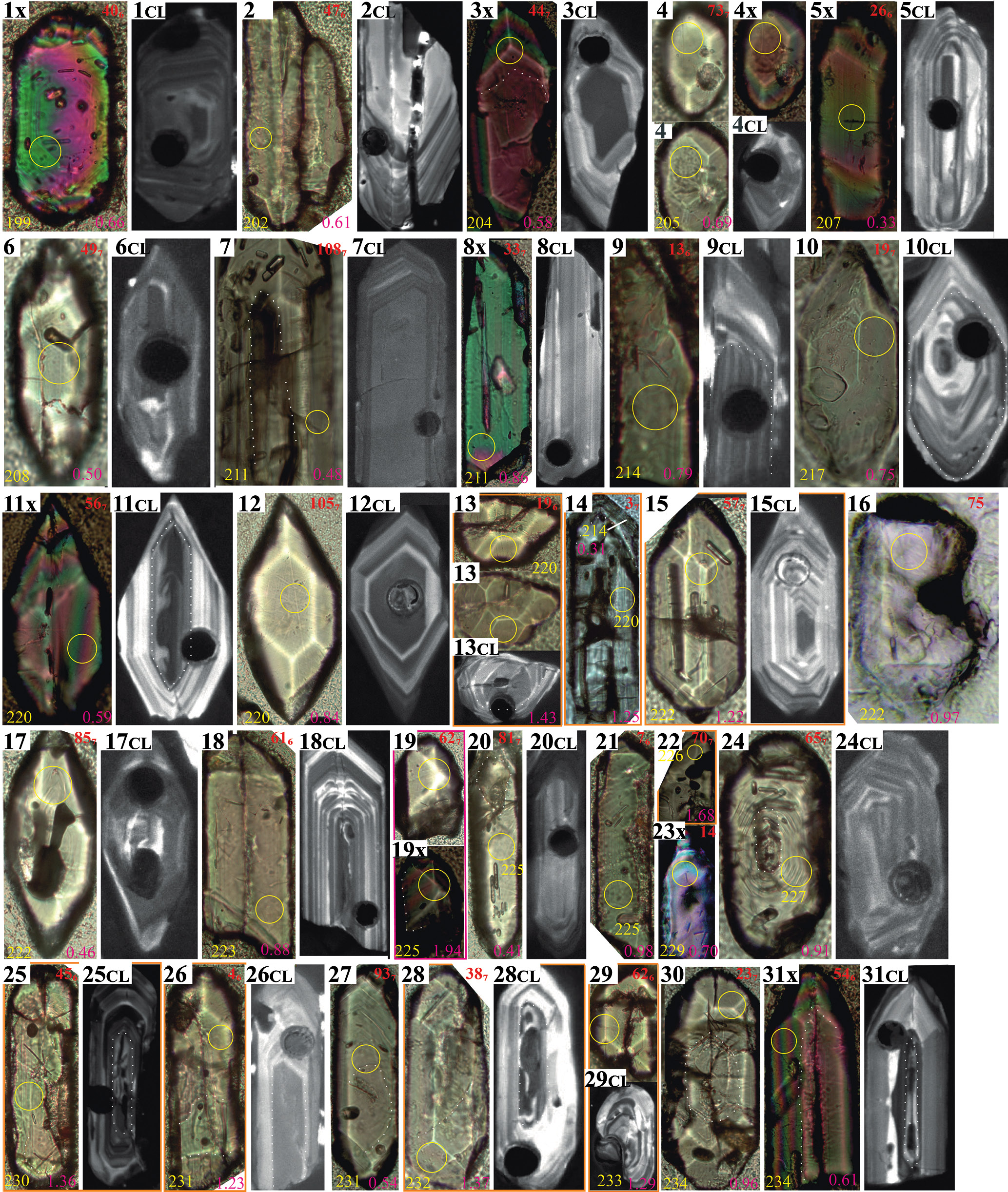 Для каждого изображения в левом верхнем углу черным цветом указан его номер, индекс “x” означает, что изображение получено при скрещенных николях; индекс “CL” – в катодных лучах. В правом верхнем углу красным цветом указан номер анализа: без индекса – из пробы N18-004, с индексом 6 или 7 (номер шашки) – из пробы К20-114. Для некоторых зерен показаны от двух до четырех изображений (либо в параллельных и скрещенных николях, либо с разной глубиной фокусировки, либо в катодных лучах). Если был произведен пробоотбор, то положение кратера лазерной абляции показано желтым кружком (диаметр 25 мкм). В случаях, когда для зерна была получена кондиционная датировка, рядом с изображением этого зерна приведен его возраст в млн лет. Белыми точечными линиями намечены видимые древние ядра зерен циркона или границы между разнородными частями