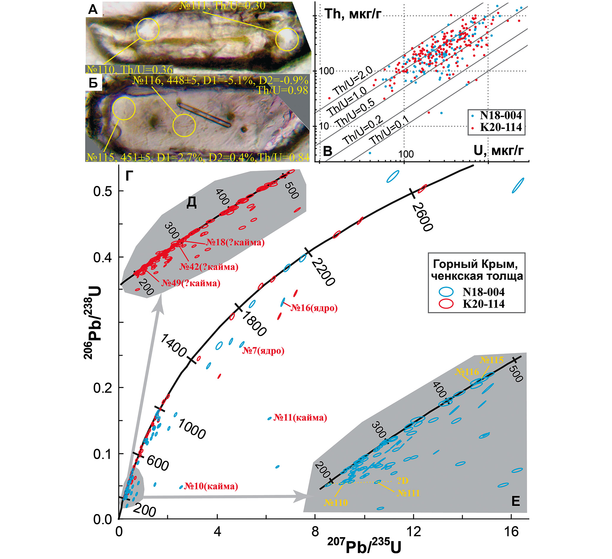 (а, б) – оптические изображения зерен детритового циркона, в которых сделано по два пробоотбора, желтые кружки – положения кратеров абляции; (в) – диаграмма содержания Th и U в изученных зернах; (г) – диаграмма с конкордией результатов изучения U–Pb изотопной системы зерен. Эллипсы показывают 68%-ный доверительный интервал измерений для всех анализов. Красным шрифтом отмечены номера анализов для специфических зерен с включениями красноватого цвета (см. рис. 7, изображения 13–18 и пояснения в тексте). В виде врезок (д, е) на сером фоне показаны увеличенные фрагменты конкордии 200–500 млн лет. На рис. 10е желтым цветом отмечены номера анализов для зерен, показанных на рис. 10а, 10б
