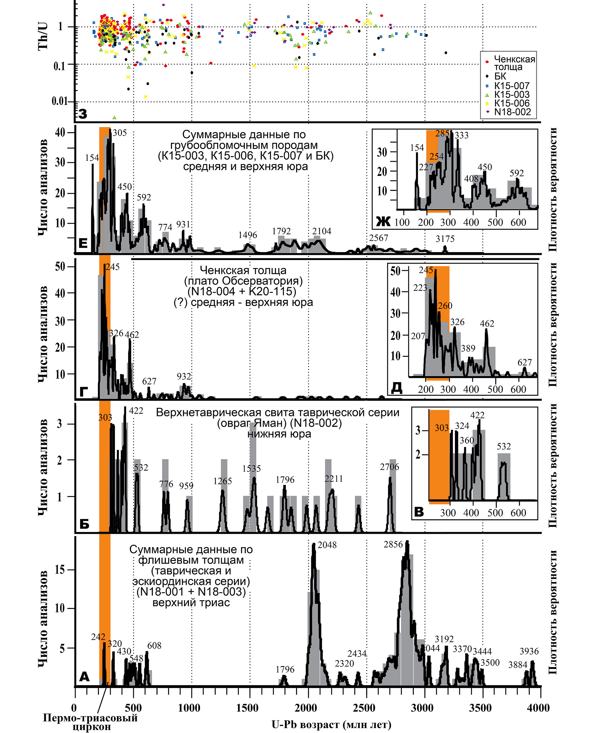 К настоящему времени уже опубликованы результаты изучения dZr из некоторых стратиграфических образований Горного Крыма. Так, в работе (Nikishin et al., 2015) представлены суммарные результаты U–Pb датирования dZr из набора проб песчаников, попадающих в стратиграфический интервал от средней юры до неогена. В работах (Никишин и др., 2016; Рудько и др., 2018, 2019; Kuznetsov et al., 2019; Романюк и др., 2020) приведены результаты изучения dZr из песчаников средне- и верхнеюрских грубообломочных толщ. В работах (Никишин и др., 2020; Кузнецов и др., 2022а) представлены результаты U–Pb изотопного датирования dZr, характеризующих песчаники из таврической и эскиординской серий.