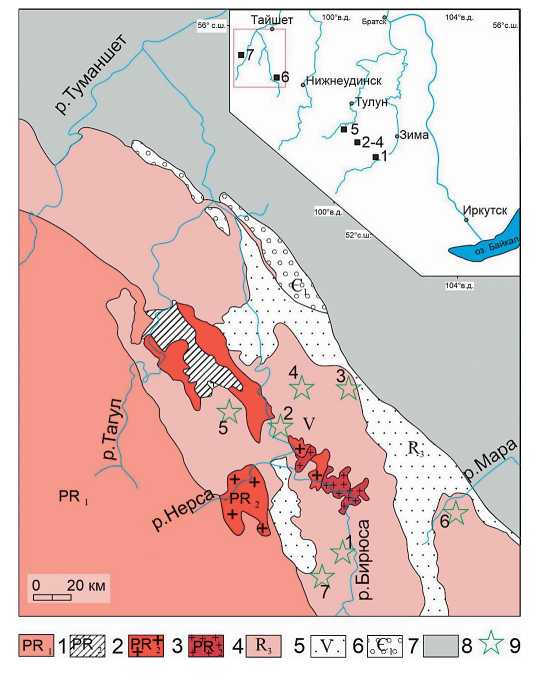 1 – бирюсинская серия, PR1; 2 – сублукская серия, PR2; 3 – саянский интрузивный комплекс, PR2; 4 – бирюсинский интрузивный комплекс, PR2; 5 – карагасская серия, R3; 6 – оселковая серия, V; 7 – усть-тагульская свита, Є1; 8 – палеозойские породы Сибирской платформы; 9 – палеовулканы Бирюсинского Присаянья (1 – Бирюсинский-1, 2 – Бирюсинский-2, 3 – Изанский, 4 – Слюдянский, 5 – Тайшетский, 6 – Марский, 7 – Кременьшетский). На врезке показан район проведения исследований. Черные квадраты – выходы позднедокембрийских щелочных и высококалиевых пород юго-западной части Сибирской платформы: 1 – лампроиты; 2–4 – щелочные породы Белозиминского, Жидойского, Большетагнинского массивов соответственно; 5, 6 – ультракалиевые трахиты; 7 – слюдяные пикриты (Егоров и др., 2010).