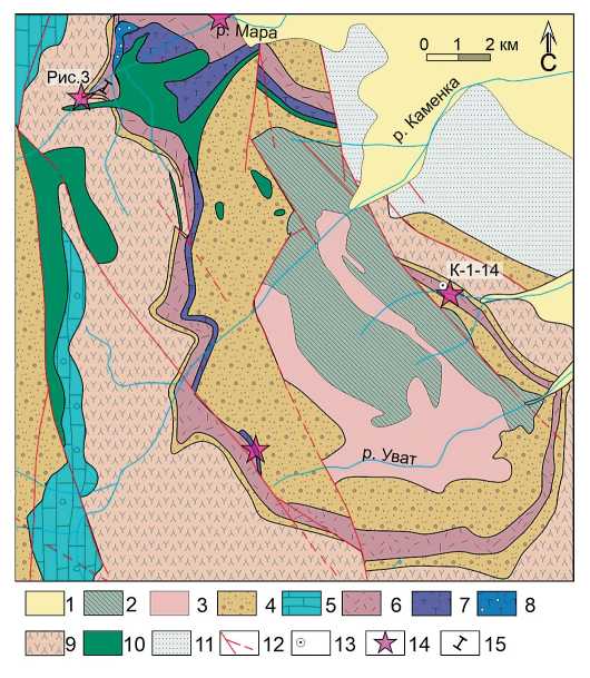 1 – четвертичные отложения; 2, 3 – вулканогенно-осадочные толщи довендского фундамента: 2 – осадочно-метаморфические отложения (нерасчлененные); 3 – вулканиты кислого состава; 4, 5 – карагасская серия: 4 – конгломератово-песчаниковые (континентальные) отложения, 5 – карбонатные отложения; 6 – вулканогенные отложения Марского палеовулкана (нерасчлененные); 7 – щелочные игнимбриты; 8 – брекчии оседания кальдерные (?); 9 – карбонатно-терригенно-туфогенные отложения; 10 – габбро-диабазы, габбро нерсинского комплекса; 11 – осадочные отложения оселковой серии; 12 – разрывные нарушения; 13 – место отбора и номер пробы для U–Pb изотопно-геохронологических исследований; 14 – место отбора проб для минералого-петрографических и геохимических исследований; 15 – местоположение сводного разреза (рис. 3).