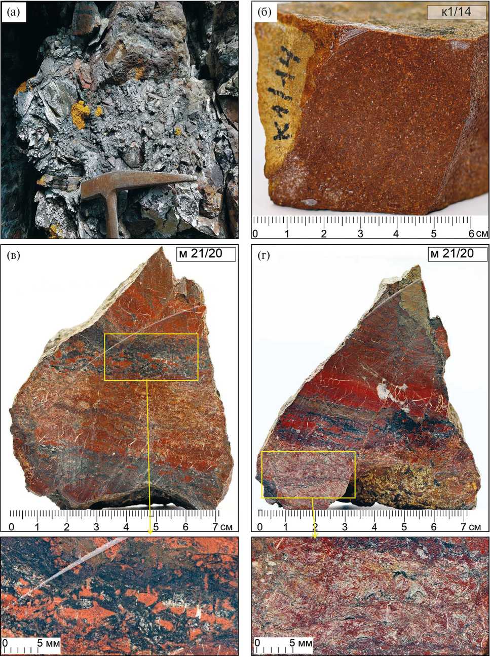 (а) – обнажение туфобрекчий; (б) – обр. К1/14-20: туфопесчаник, в котором проводилось U–Pb датирование по циркону; (в, г) – обр. М21/20: переслаивание лиловых туфов и игнимбритов. Фото авторов.