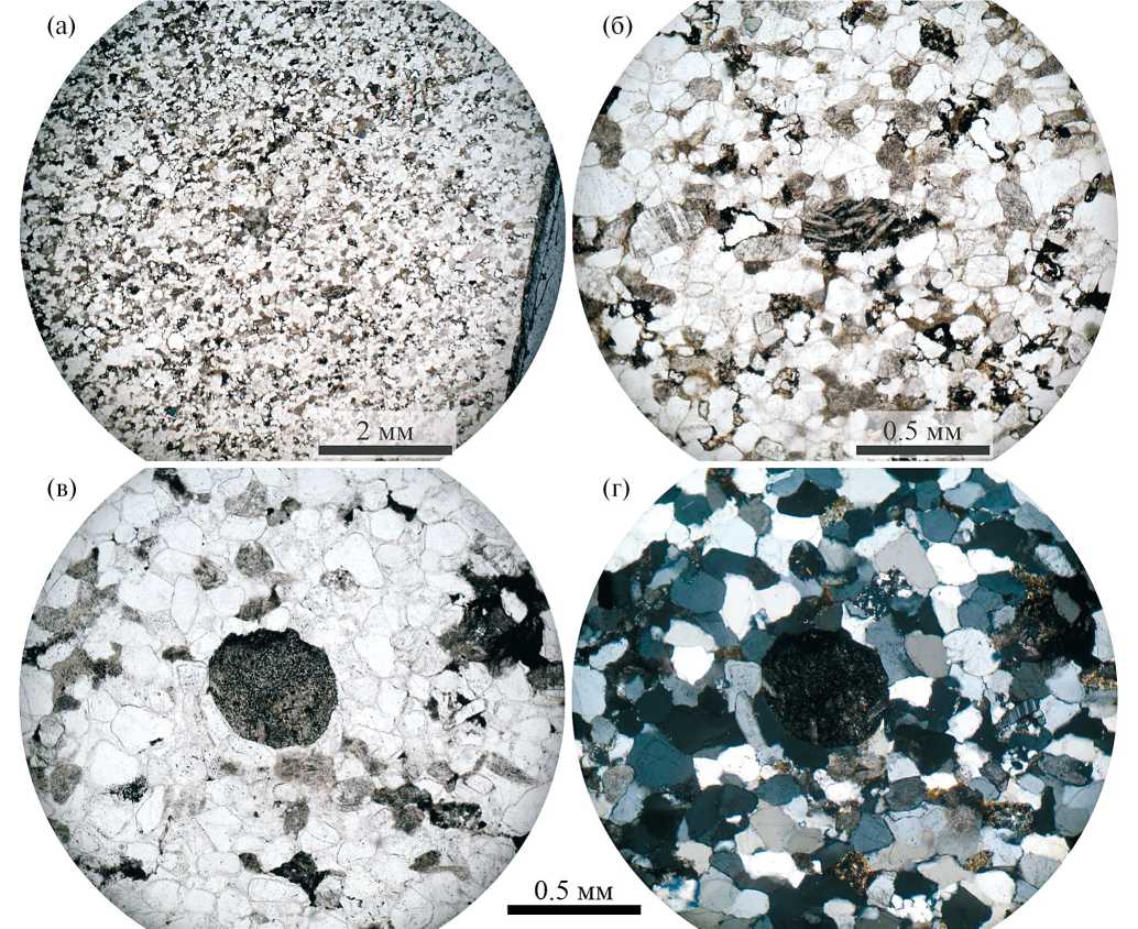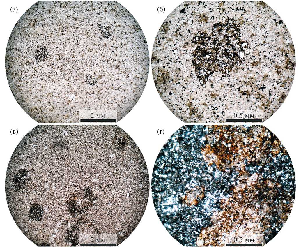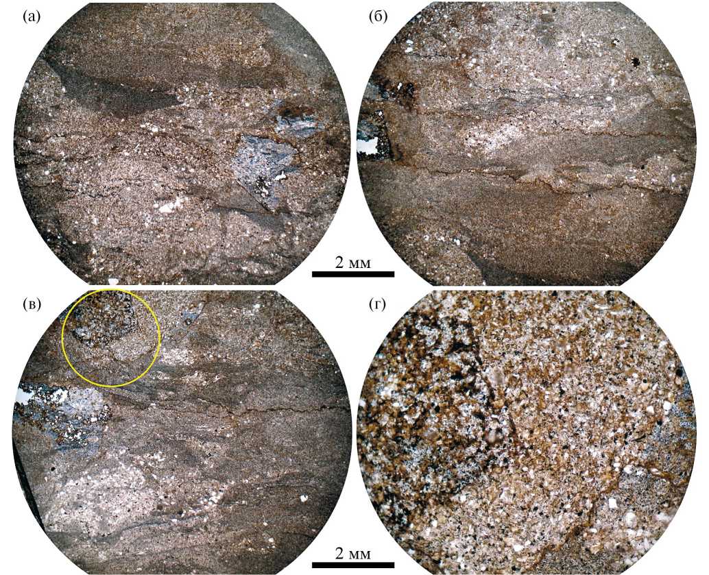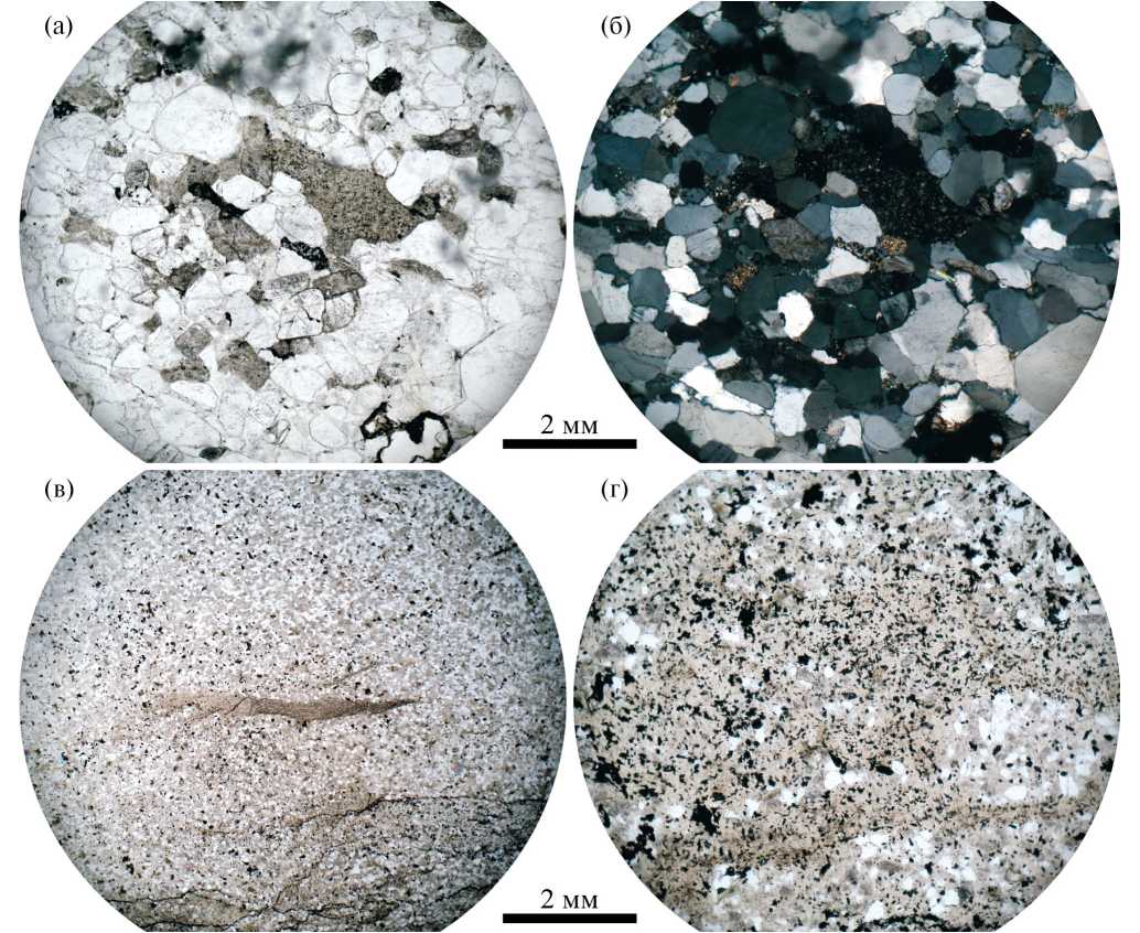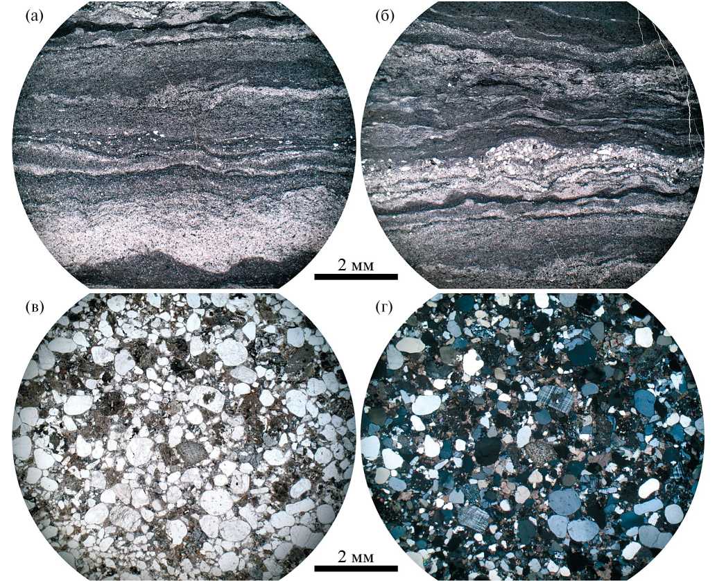 Рис. 5. (а, б) Тонкое переслаивание витрокристаллокластических туфов, туфоалевролитов и песчаников с туфовым материалом (обр. МР15-21), николи параллельны; (в, г) песчаник с примесью вулканогенного материала (обр. МР16-21): (в) – николи параллельны, (г) – николи скрещены. Фото шлифов.