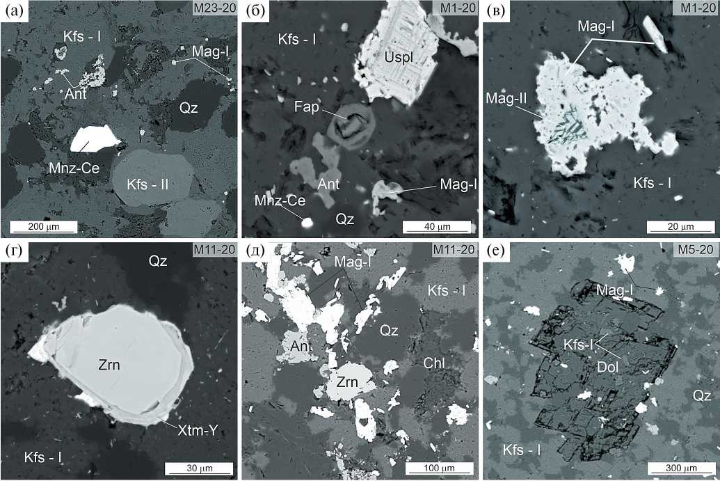 Исследования текстурно-структурных характеристик пород и состава минералов проводились на сканирующем электронном микроскопе (СЭМ) Tescan MIRA 3 LMU с ускоряющим напряжением 15 кВ и током 1.5 нА, с помощью энергодисперсионной рентгеновской приставки INCA Energy 450 X-Max 80 Oxford Instruments, совмещенной с СЭМ, и программы микроанализа Oxford Instruments INCA 5.05. Химический состав апатита определен на микрозонде Camebax-micro, при 20–25 нА и 20 кВ, время анализа для каждого элемента 10 с. Для анализа подбирались зерна размером более 10 мкм (размер пучка зонда 2 мкм). Для калибровки в качестве стандартов использовались синтетический хлорапатит и природный фторапатит.