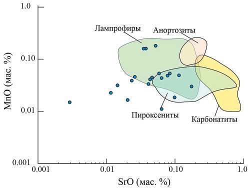 Изучение минерального состава вулканокластических пород Марского палеовулкана показало, что вкрапленники и кристаллокласты представлены калиевым полевым шпатом с повышенным содержанием бария (до 2%), тогда как этот минерал в основной массе не содержит примесей натрия и бария. Характерным является набор акцессорных минералов: циркон, монацит, ксенотим, анатаз, титаномагнетит, фторапатит. Подобный набор акцессорных минералов и их состав характерен для интрузивных пород зиминского комплекса. Наиболее вероятно, что источником поступления обломочного материала для вулканогенно-осадочных пород Марского поля являются породы, аналогичные зиминскому комплексу. Это подтверждается наличием прослоев пород, содержащих калиевый полевой шпат с включениями зональных, хорошо ограненных кристаллов доломита и анкерита. Подобные породы описаны в скважине Большетагнинского массива (Изох и др., 2020).