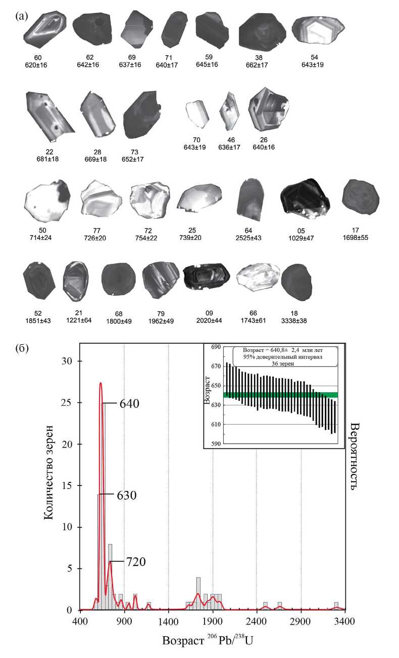 Рис. 13. (а) Катодолюминесцентные изображения цирконов из вулканомиктовых высококалиевых пород (проба К-1-14) с указанием возраста (млн лет); (б) гистограмма, графики плотности вероятности распределения U–Th–Pb изотопного возраста циркона и его средневзвешенное значение из вулканомиктовых высококалиевых пород (по отношению 206Pb/238U, погрешность 1s).