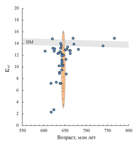 Рис. 14. Диаграмма возраст (млн лет)–εHf(t) для цирконов из высококалиевой пирокластики Марского палеовулкана (залитые (в электронной версии синие) кружки) в сравнении с данными из карбонатитов массива Белая Зима (залитое (в электронной версии оранжевое) вертикальное поле) (Хромова и др., 2020). ДМ – деплетированная мантия.