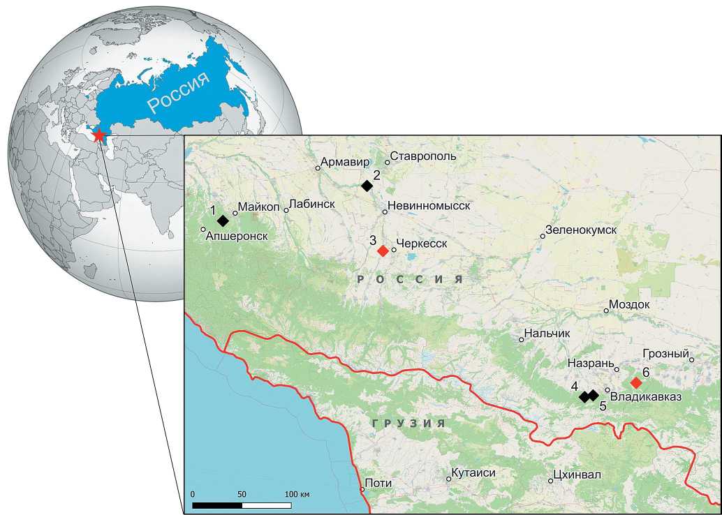 В 2019–2020 гг. нами проводилось изучение стратотипического разреза кавказского региояруса по р. Кубань (г. Черкесск, Карачаево-Черкесская Республика). После постройки плотины выше г. Черкесска и отвода части воды р. Кубань в водохранилище, обнаженность этого разреза стала значительно хуже, однако полевые работы в осеннюю межень реки позволили описать и отобрать несколько образцов из алкунской свиты. Подробное описание стратотипического разреза кавказского региояруса с нашими данными приведено в монографии “Неоген Восточного Паратетиса: региоярусная шкала, опорные разрезы и проблемы корреляции” (Попов и др., 2023). Дополнением к полученным материалам послужили образцы наших предыдущих сборов по руч. Фюнтв (приток р. Белая, Адыгея) и образцы из коллекции Е.В. Белуженко по разрезам р. Кубань (пос. Карамурзинский, Ставропольский край) и рр. Фиагдон и Майрамадаг (Северная Осетия).