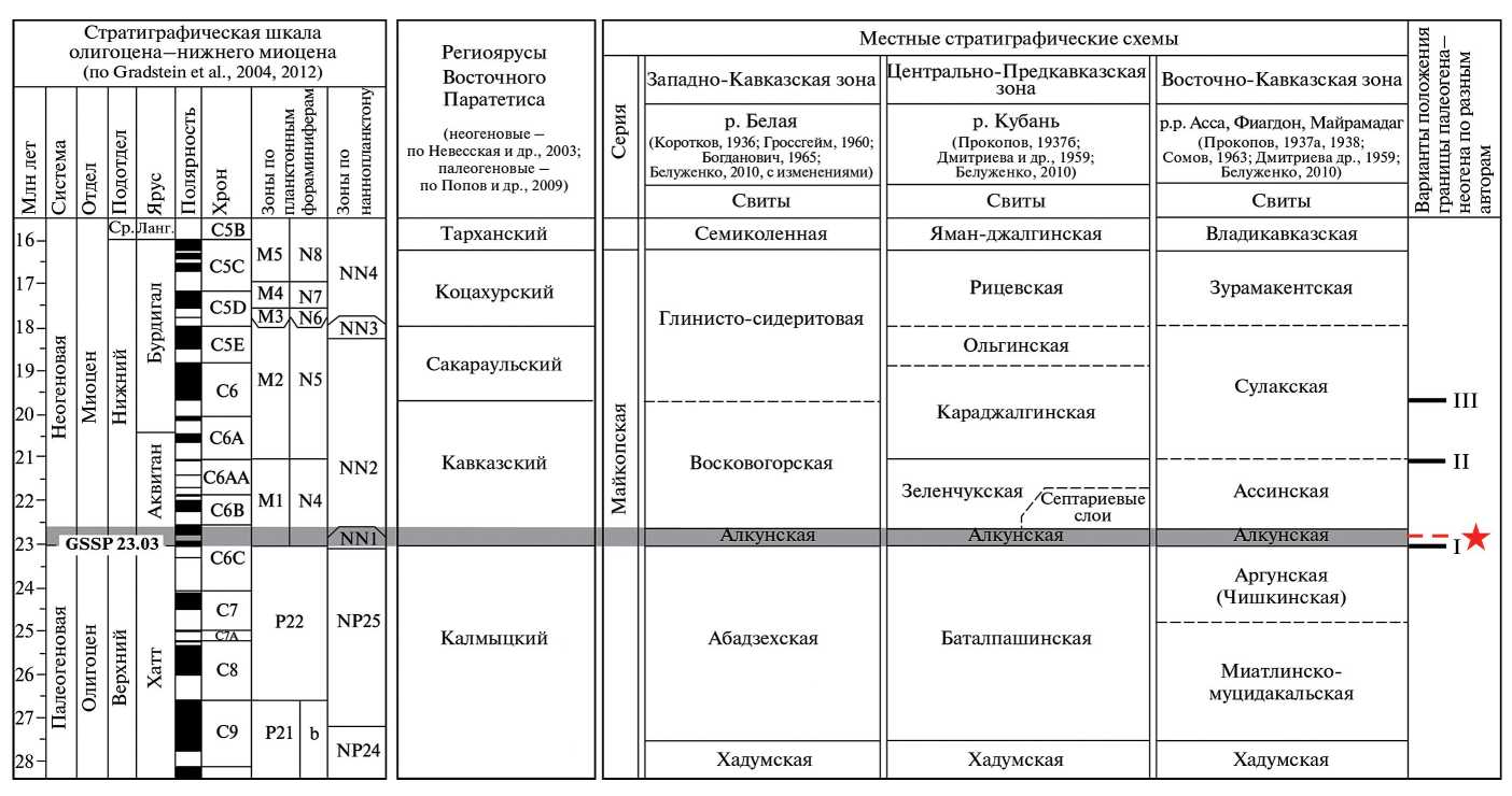 Дальнейшее изучение алкунских отложений было продолжено в опорном разрезе майкопских отложений по р. Белая (Адыгея) (Akhmetiev et al., 1995; Krhovsky et al., 1995; Запорожец, 1999; Попов и др., 2023). В разрезе по р. Белая выше устья руч. Фюнтв в низах алкунского горизонта был найден наннопланктон зоны NP25 шкалы Мартини и комплекс диноцист, в котором впервые в майкопских разрезах появляются таксоны, имевшие преимущественно миоценовое распространение (Akhmetiev et al., 1995). Немного выше по мощности (10–15 м), в устье руч. Фюнтв и напротив него на левом берегу р. Белая Л.А. Головиной установлен биогоризонт с Cyclicargolithus floridanus (Попов и др., 2023). В нем, вслед за Я. Крховским (Krhovsky et al., 1995), подтверждены единичные находки вида-индекса Triquetrorhabdulus carinatus, что, при отсутствии типичных элементов олигоценовой наннофлоры, коррелируется с интервалом перехода от олигоцена к миоцену и скорее датируется базальной частью миоцена зоны NN1 шкалы Мартини (Martini, 1971). По данным Н.И. Запорожец установлен комплекс диноцист с массовыми Deflandrea spinulosa и редкими Chiropteridium partispinatum, что характерно для переходных слоев от хатта к аквитану (Запорожец, Ахметьев, 2017; Popov et al., 2022). Впоследствии в стратотипе кавказского региояруса – разрезе р. Кубань у г. Черкесска – алкунский горизонт и низы септариевых слоев зеленчукской свиты Г.Н. Александровой отнесены к слоям с Deflandrea spinulosa, которые охватывают интервал терминальной части хатта–низов аквитана (Александрова и др., в печати; Попов и др., 2023). Первоначально в известковистых глинах алкунской свиты по руч. Фюнтв (притоку р. Белая) А.К. Богдановичем был установлен достаточно представительный комплекс бентосных фораминифер, характерный для виргулинелловых слоев подошвы кавказского региояруса (Богданович, 1986). Позднее Т.Н. Пинчук включила этот комплекс в слои с Fursenkoina schreibersiana–Caucasina sp. (Пинчук, 2006, 2018).