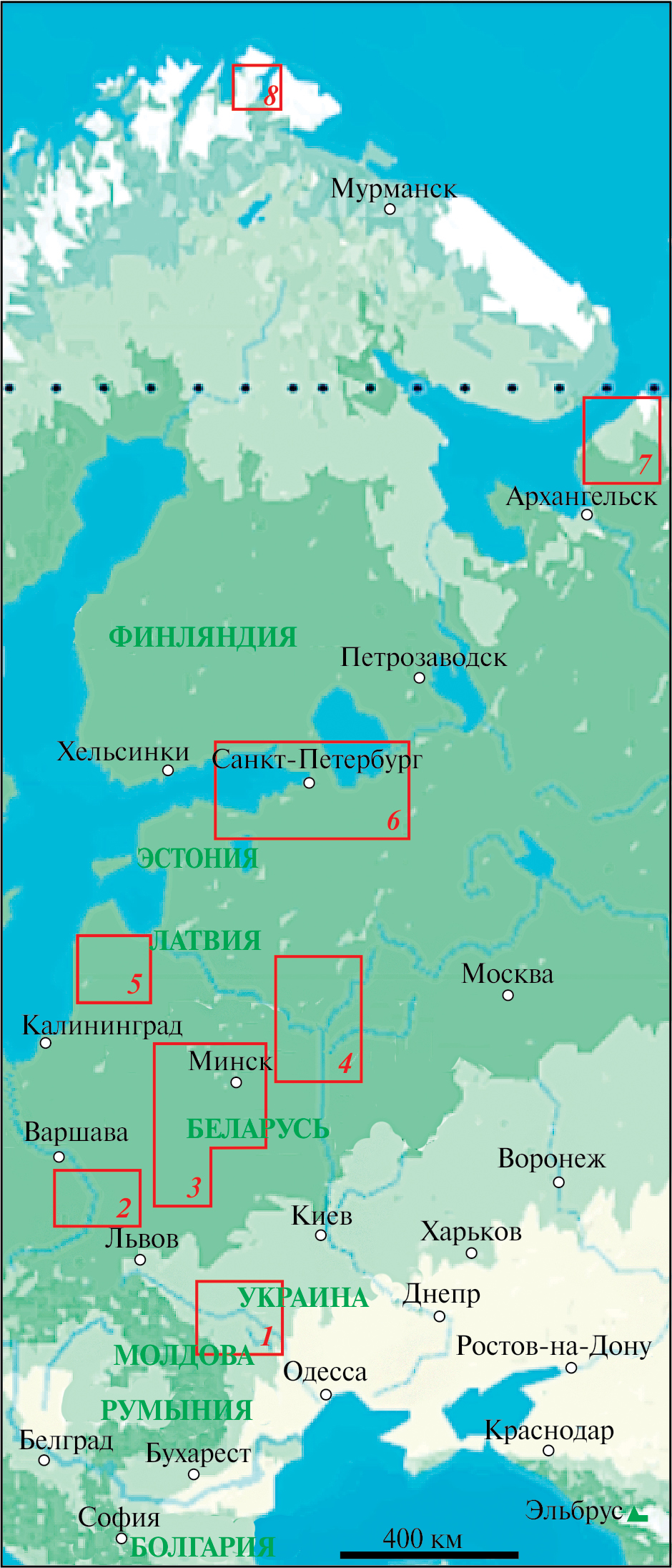 1 – Подольское Приднестровье; 2 – Юго-Восточная Польша; 3 – Западная Беларусь и Волынь; 4 – Восточная Беларусь; 5 – Литва; 6 – окрестности г. Санкт-Петербурга; 7 – Юго-Восточное Беломорье; 8 – Арктическая Норвегия.