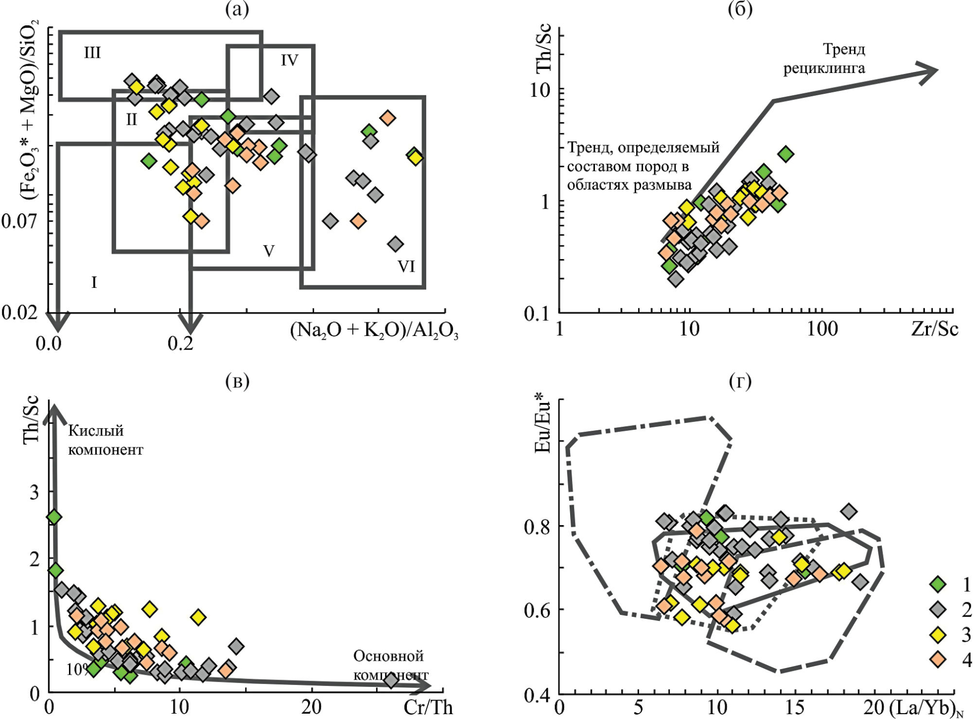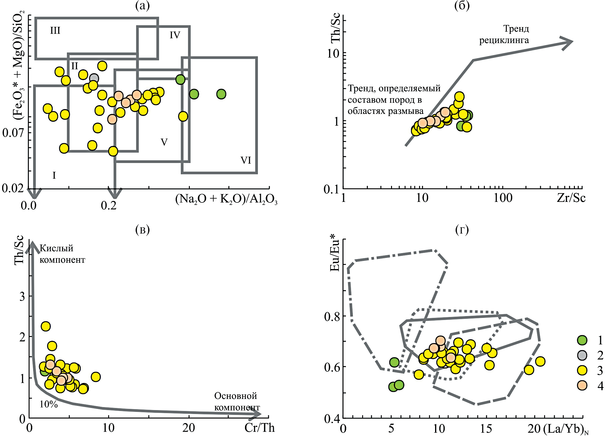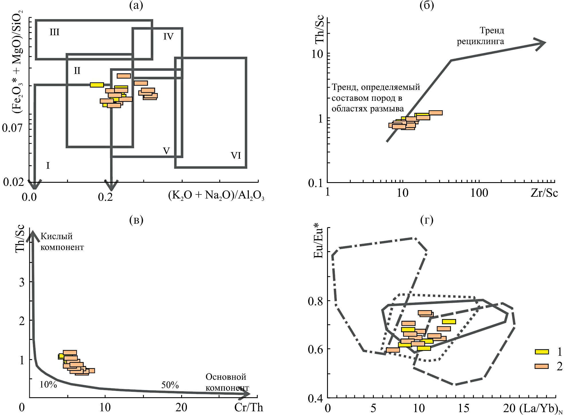 Рис. 10. Положение точек состава аргиллитов венда Юго-Восточного Беломорья на диаграммах (K2O + Na2O)/Al2O3–(Fe2O3* + MgO)/SiO2 (а), Zr/Sc–Th/Sc (б), Cr/Th–Th/Sc (в), (La/Yb)N–Eu/Eu* (г).
