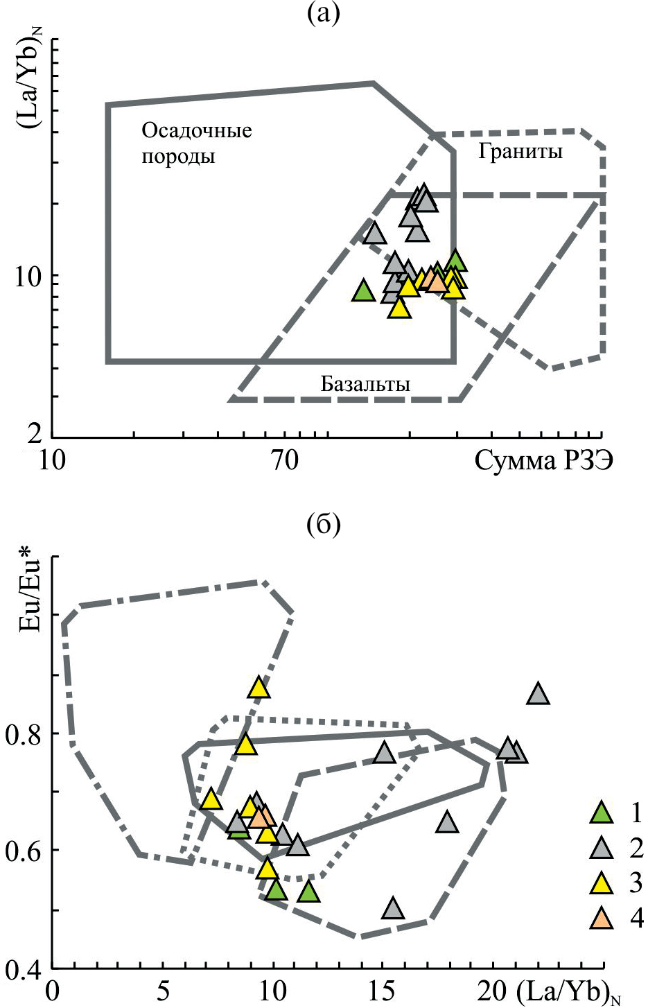 Суммированные в работе (Bayon et al., 2015) данные о распределении ряда редких и рассеянных элементов в пелитовых фракциях донных осадков приустьевых зон различных категорий современных рек мы рассматриваем как отражающие состав тонкой взвеси, транспортируемой реками в приемные бассейны из различных питающих провинций. Особенности редкоземельной и Th-систематики пелитовой фракции донных осадков приустьевых частей современных рек различных категорий достаточно хорошо проявлены на диаграммах (La/Yb)N–Eu/Eu*, (La/Yb)N–(Eu/Sm)N и (La/Yb)N–Th (Маслов, 2019; Маслов, Шевченко, 2019). Установлено, что граничные величины (La/Yb)N для полей состава пелитовой фракции донных осадков приустьевых участков современных рек ориентировочно составляют 6–20 для рек категории 1, 6–16 для рек категории 2, 9–21 для рек категории 3 и 1–11 для рек категории 4. Аналогичные граничные величины Eu/Eu* составляют соответственно 0.60–0.80, 0,55–0.82, 0.45–0.75 и 0.58–1.05, а содержания Th – 6–22, 9–33, 15–37 и 1–13 мкг/г. Указанные диаграммы использованы нами ранее при реконструкции категорий речных систем, поставлявших тонкую алюмосиликокластику для осадочных последовательностей верхнего докембрия Западного Урала (Маслов, 2019, 2020), севера и востока ВЕП (Маслов, Подковыров, 2021а) и ряда других объектов, в том числе и для анализа особенностей формирования метаалевропелитов архея и нижнего протерозоя (Маслов, Подковыров, 2021б). В публикации (Маслов, Мельничук, 2023) на основе анализа литогеохимических характеристик глинистых пород почти 40 осадочных последовательностей неопротерозоя–ордовика и девона–голоцена показано, что принципиальных отличий между досилурийскими реками и реками “зеленой эпохи” с точки зрения их категорий не наблюдается. В перечисленных работах рассмотрен и ряд других концептуальных вопросов применения указанных диаграмм, в том числе и то, что для наших целей могут быть использованы валовые пробы глинистых пород, не подвергшиеся какой-либо предварительной обработке (Маслов, Шевченко, 2019).