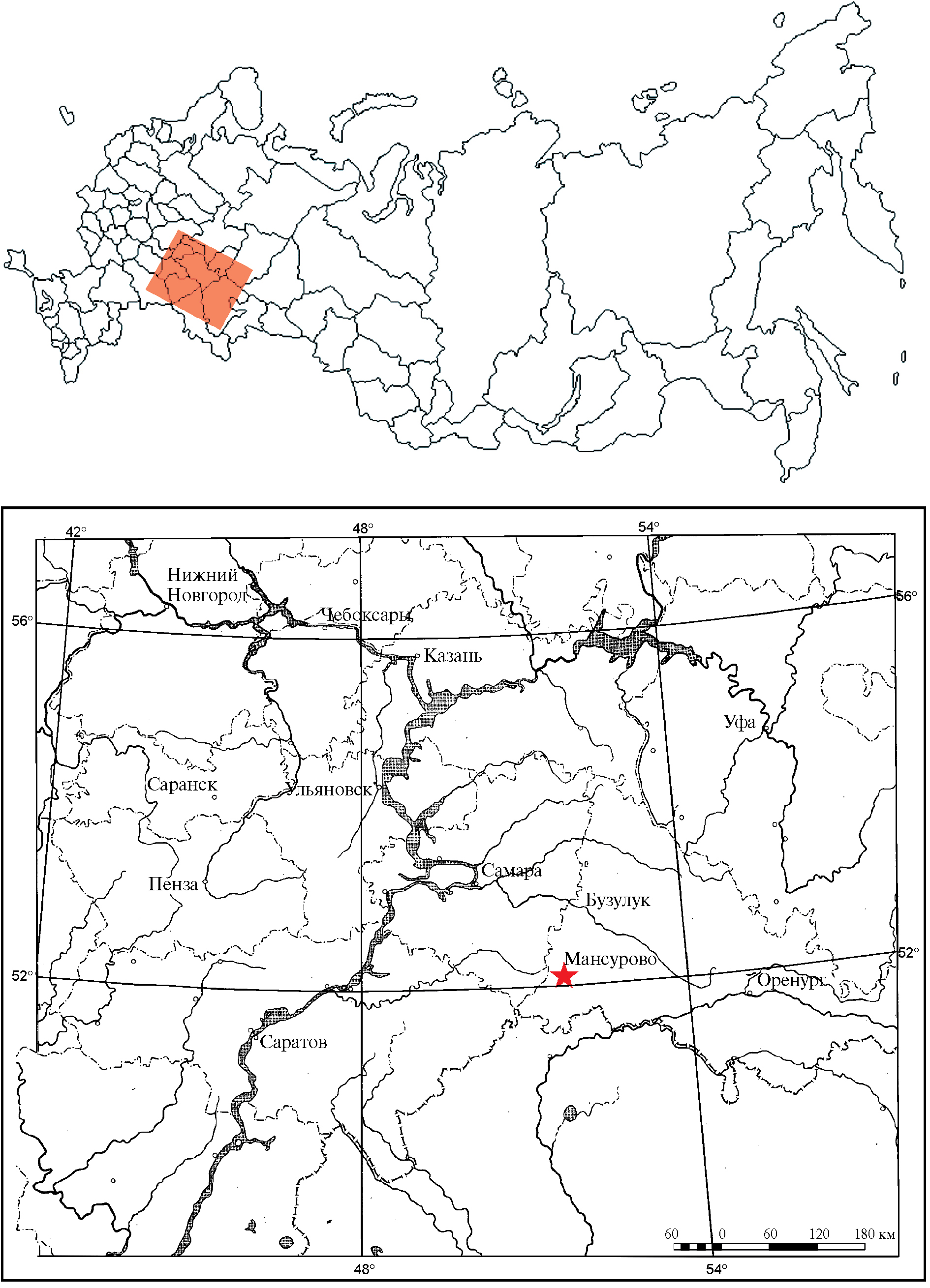 В 2016 г. в Первомайском районе Оренбургской области у пос. Мансурово было открыто новое местонахождение раннетриасовых тетрапод и ихнофоссилий (Сенников и др., 2023; Ульяхин и др., 2023а, 2023б, 2023в). Местонахождение Мансурово расположено в карьере в 1.5 км на север–северо-восток от одноименного поселка (рис. 1). Вскрытые здесь крайне неравномерно отложения относятся к гостевской свите устьмыльского горизонта нижнеоленекского подъяруса. Проводимое нами изучение местонахождения Мансурово существенно дополняет как геологическую, так и палеонтологическую характеристику этой свиты.
