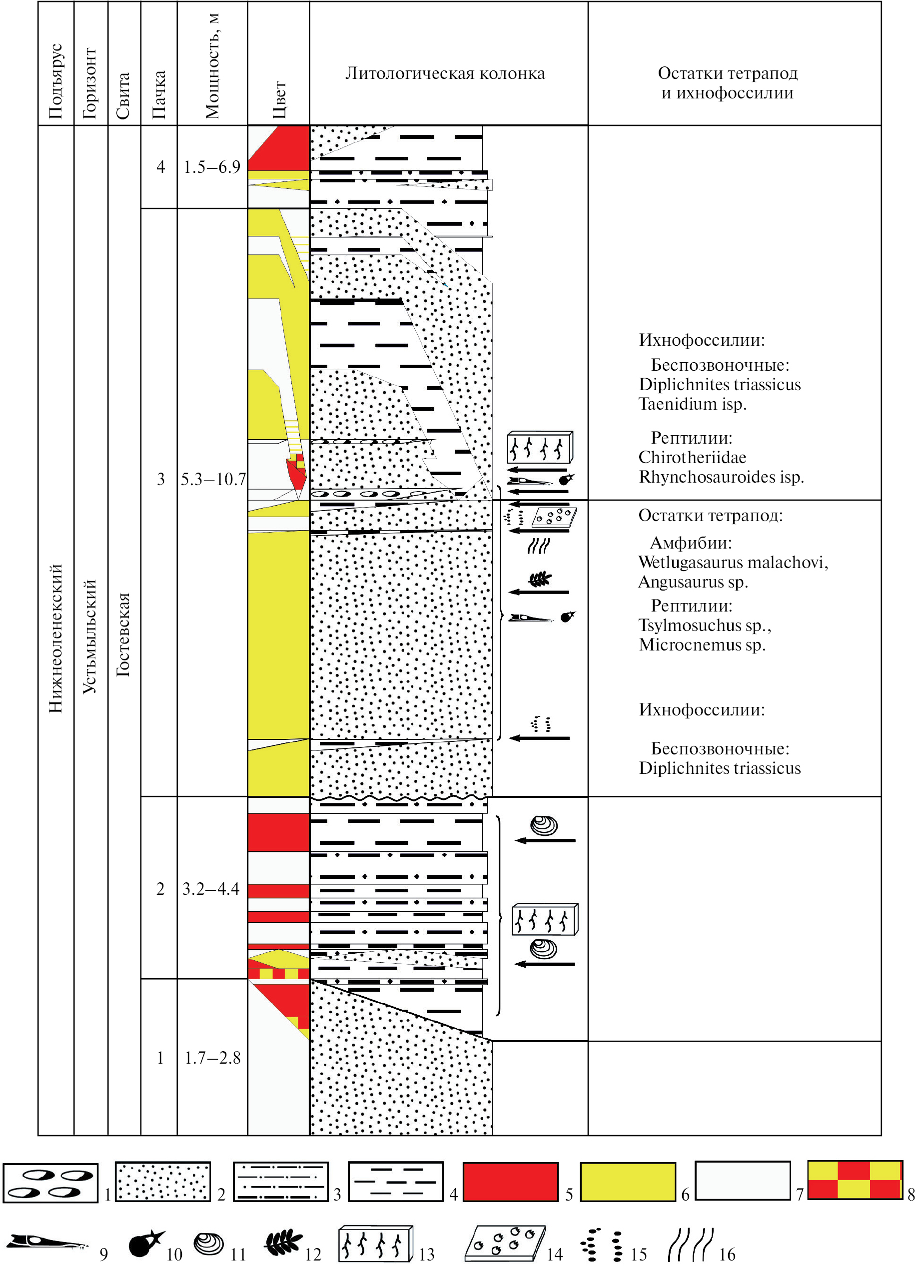 1 – конгломерат; 2 – песчаник; 3 – алеврит; 4 – глина; 5 – красновато-бурые, зеленовато- и голубовато-серые породы; 6 – светло- и желтовато-серые породы; 7 – желтовато-серые и серые породы; 8 – пестрые породы; 9 – остатки амфибий; 10 – остатки рептилий; 11 – конхостраки; 12 – ядра фрагментов побегов; 13 – ризолиты; 14 – следы Chirotheriidae и Rhynchosauroides isp.; 15 – следы Diplichnites triassicus; 16 – следы Taenidium isp.