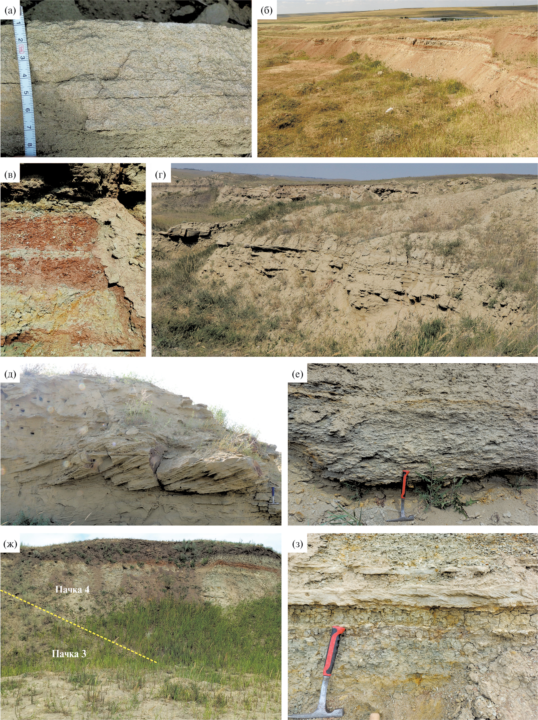 (а) – песчаник пачки 1; (б, в) – переслаивание красноцветных глин и светло-серых алевритов пачки 2; (г) – песчаники пачки 3; (д) – хорошо сцементированные линзовидные проявления косослоистых песчаников в низах пачки 3; (е) – линза конгломерата в низах пачки 3; (ж) – контакт песчаных отложений пачки 3 и глинистых отложений пачки 4; (з) – глинистые отложения пачки 4 с тонкими линзовидными прослоями песчаника. Длина масштабной линейки 150 мм.