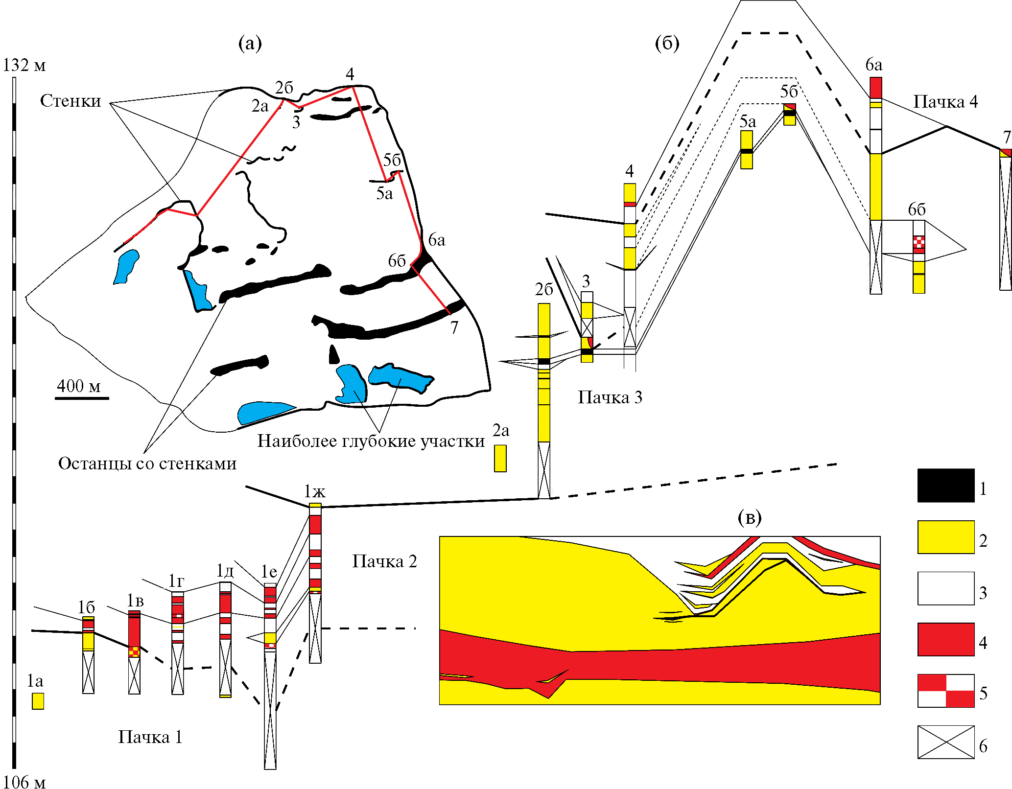 (а) – схема местонахождения с обозначением линии разреза 1а–7; (б) – корреляция по вскрышам 1а–7; (в) – геологическая модель по линии разреза 1а–7. Условные обозначения: 1 – конгломерат, 2 – песчаник, 3 – сероцветные глины и алевриты, 4 – красноцветные глины и алевриты, 5 – пестрые глины и алевриты, 6 – необнаженные участки.